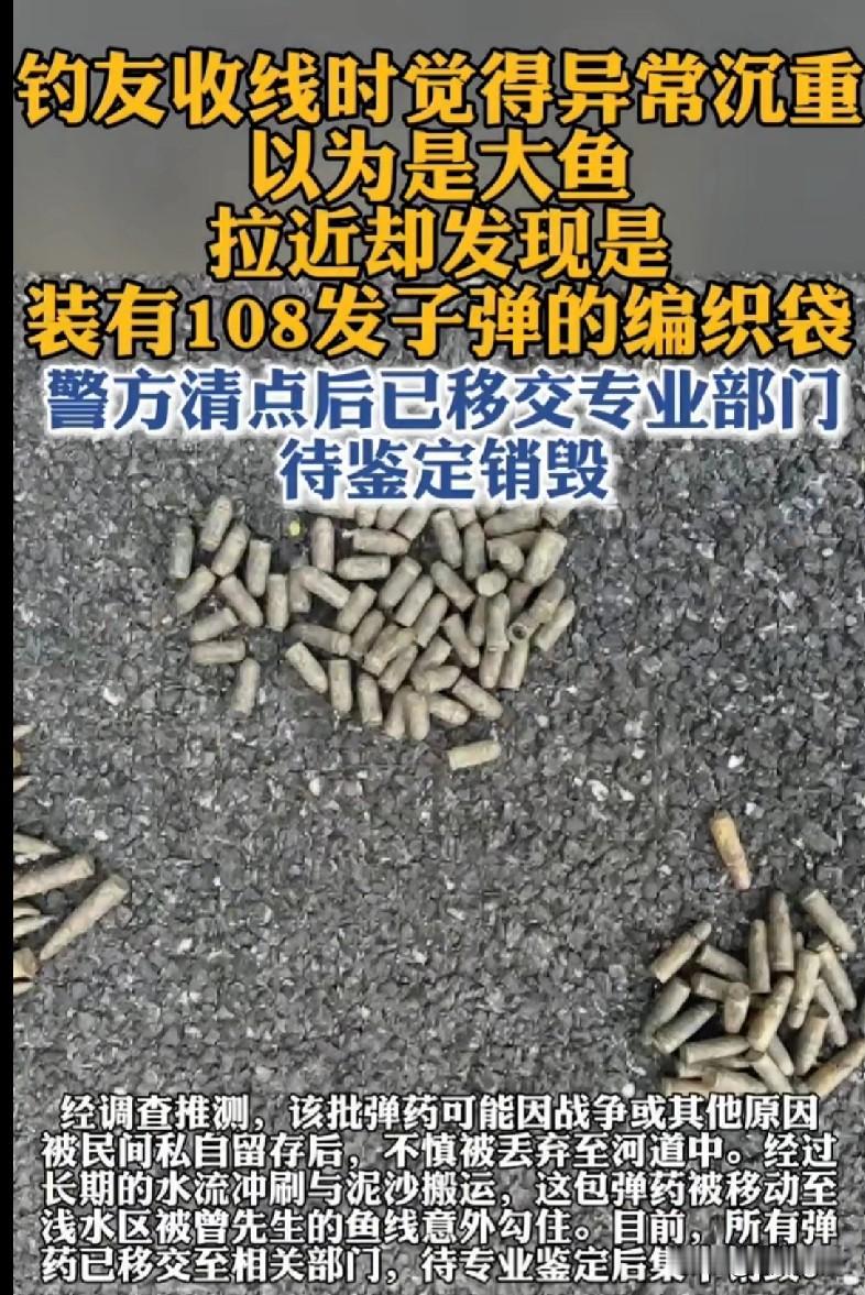 钓友收线时胳膊都沉得发酸——心里狂喜:这不得是条几十斤的巨物?结果拉近一看,编织袋里哗啦啦倒出来一堆“铁疙瘩”,数了数居然是108发子弹! 这哪是钓鱼,是钓了个“炸弹盲盒”啊!后来推测这是以前私存的弹药,被水冲到浅水区,刚好勾住了鱼线。 钓友当时估计腿都软了,赶紧报了警,现在这些子弹已经交给专业部门,等着鉴定销毁呢。 咱就是说,钓鱼佬的快乐和惊吓永远成正比——本来想爆护,结果差点“爆雷”!以后野钓碰到沉得离谱的“鱼”,先别激动,搞不好是啥危险玩意儿!