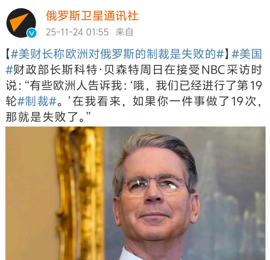 美国财长贝森特周日在接受NBC采访时,他一句话就戳中了欧洲的肺管子:“在我看来,如果你一件事做了19次,那就是失败了!”贝森特说,有些欧洲人告诉他,“我们已经进行了第19轮制裁”,于是他一句话就揭示了这种动作背后那荒谬的结果:失败!其实还有一个可笑的现实是:2024年欧洲从俄罗斯进口了约240亿美元的能源,约占俄罗斯当年能源出口的十分之一!这表明欧洲既离不开俄罗斯的能源进口,又阻止不了俄罗斯的能源出口。打个比方,一群村民群情激奋要求给某个村霸一点颜色看看,却又不停在村霸那里买柴火烧饭,这“颜色”还怎么给?