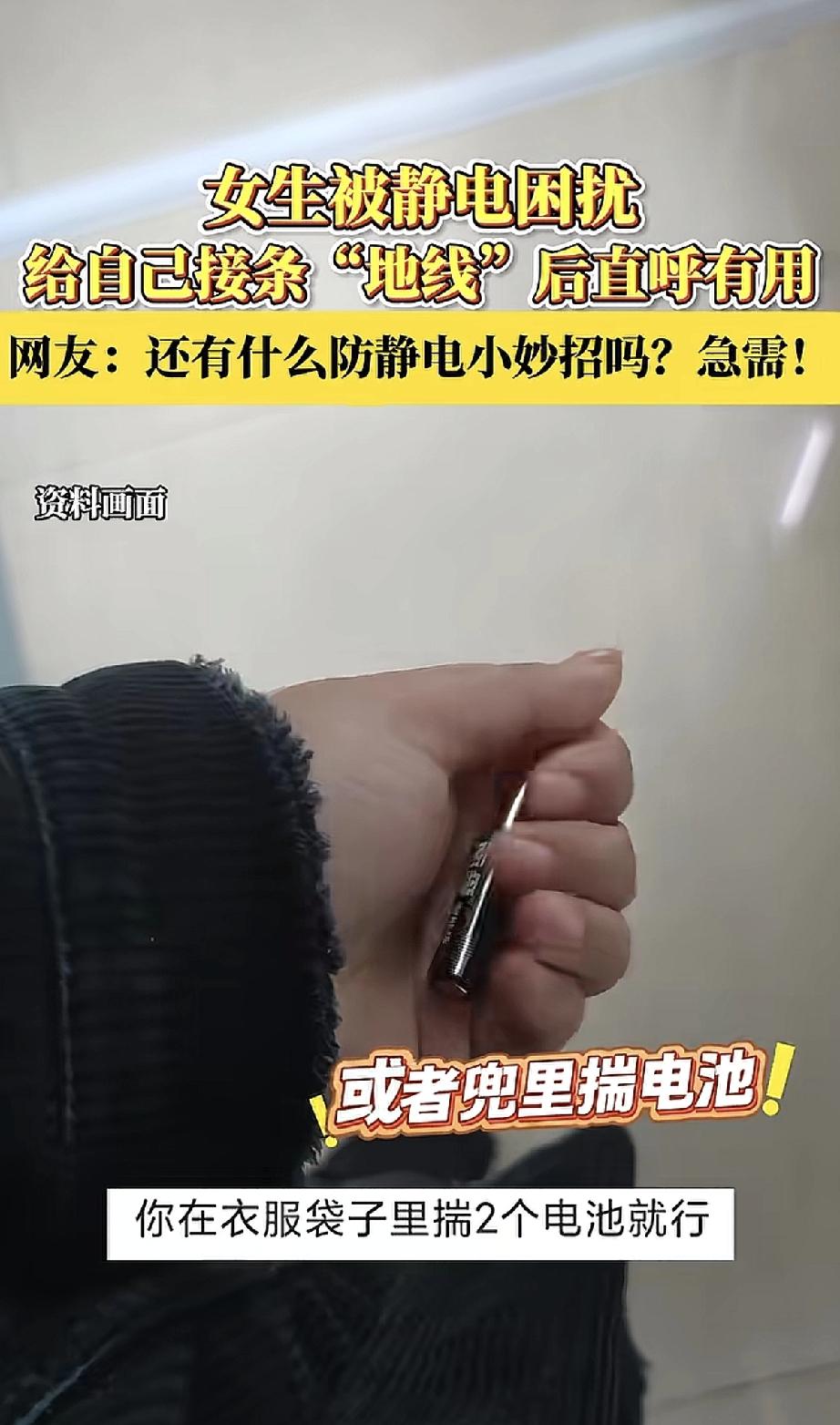 这静电真是冬天里的小烦恼! 有个姑娘想了个妙招——在衣服下摆系了根小铁链当“地线”,果然不再被电了。网友们也纷纷支招:兜里揣两节电池,或者摸墙、用钥匙碰下金属物再开门,都能有效防静电。 其实原理很简单,就是提前把身上的电放掉。下次被电怕了,试试这些法子。揣电池尤其方便,既不显眼又管用。 冬天虽然干燥,但咱们有的是办法对付静电。这些小妙招,总有一个适合你!