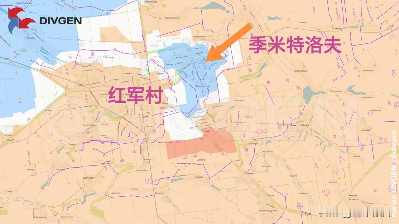 红军村东南田野,俄中央集群在过去一天之内又撕下一片,季米特洛夫南部这一大片田野马上就没了。 这里的乌军日子过得太难,没有物资补给,大多退到了季米特洛夫,俄军突击队清理这些田野中的防风林快多了。也许没过3到4天,就到季米特洛夫南部郊区了。