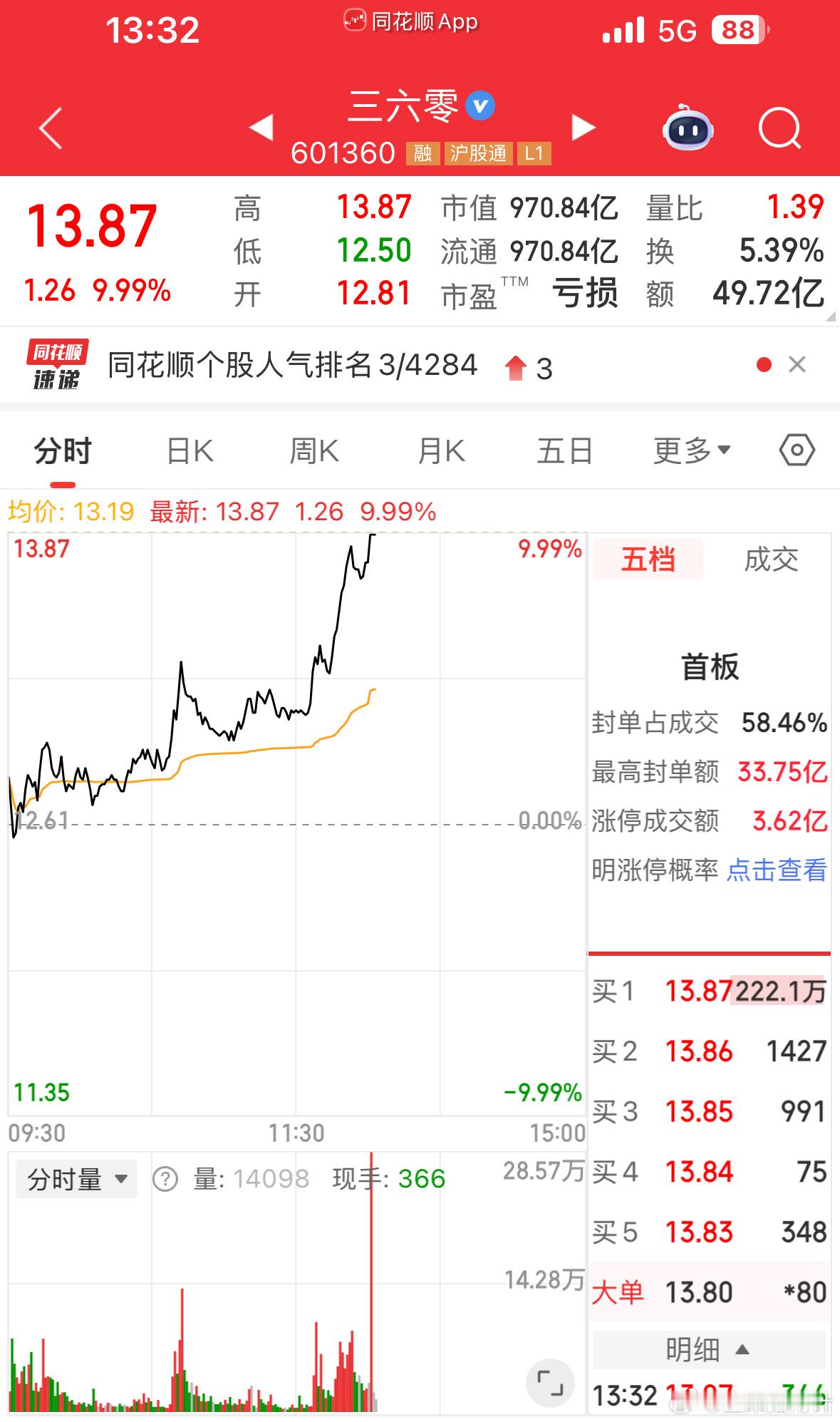 不负众望,三六零拉升5个多点,大家点赞支持吧