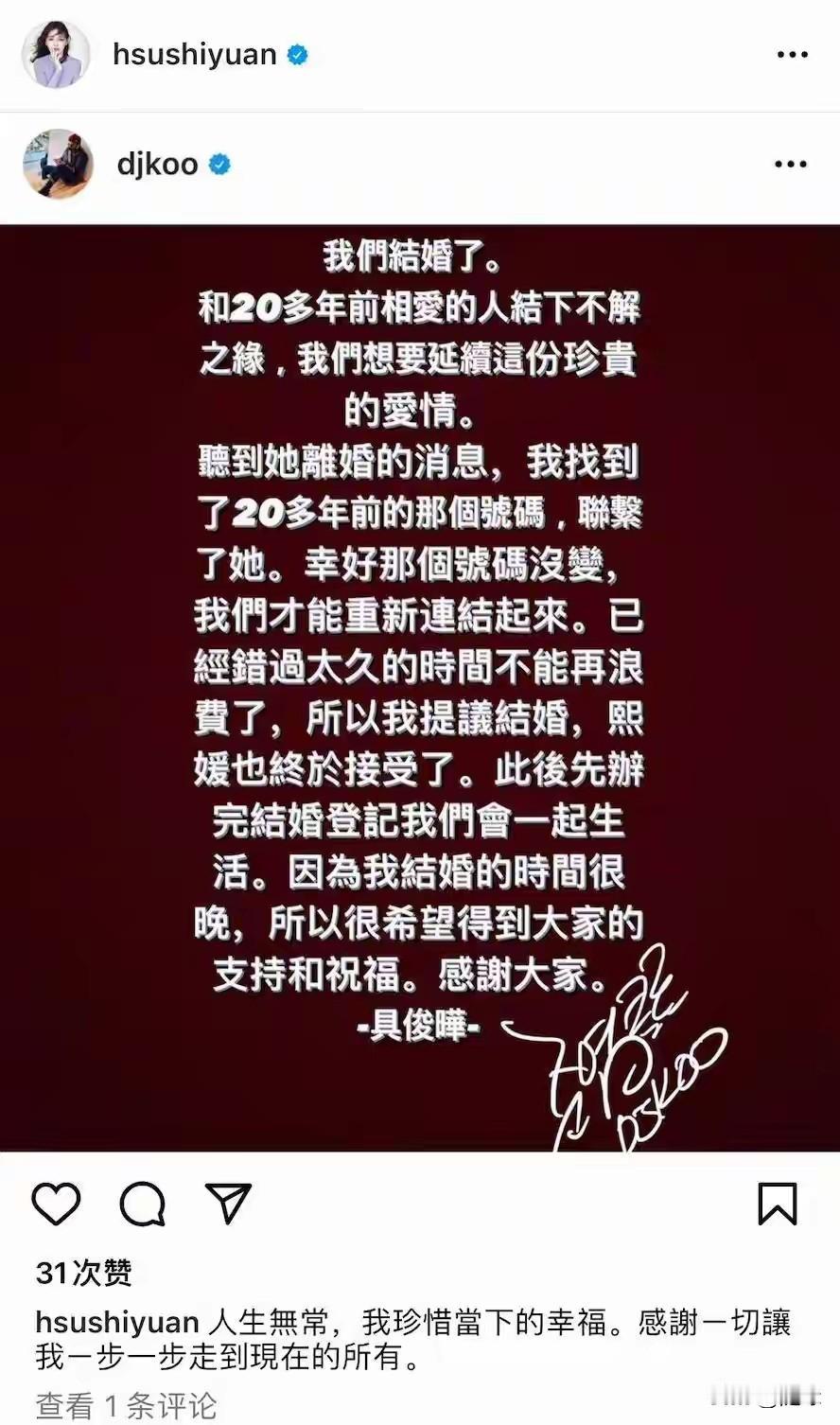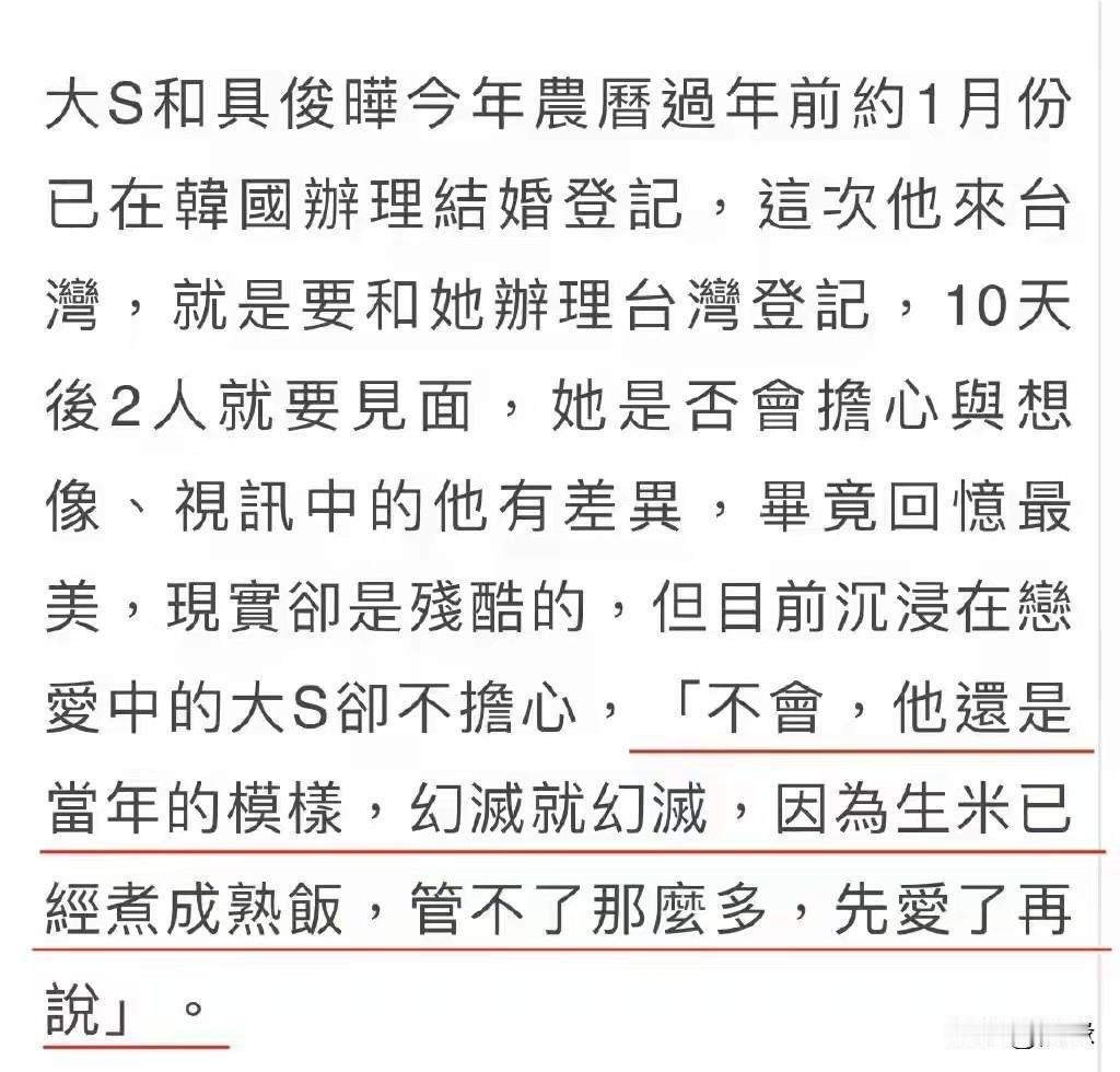 大S和具俊晔的爱情故事太精彩了,电视剧都不敢这么演! 具俊晔发文:我们结婚了!和20多年前相爱的人结下了不解之缘,我们想要延续这份珍贵的爱情。听到她离婚的消息,我找了20多年前的那个电话号码,联系了她。幸好那个号码没变,已经错过太久的时间,不能再浪费了,所以我提议结婚…… 大S霸气表示:尊重具俊晔的决定,觉得他还是当年的模样幻灭就幻灭吧,因为生米已经煮成熟饭了,管不了那么多,先爱了再说! 其实,他们两个的性格还是相当的互补,大S敢爱,具俊晔敢等,还非常的默契。 最神奇的是,时隔二十几年,他们两个竟然都还保留了对方的电话号码,竟然都还没忘记对方。这样的爱情能说不是真爱吗?