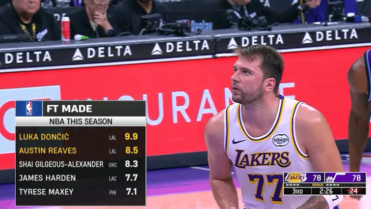 NBA常规赛,湖人对阵爵士的全场比赛已结束,湖人108-106爵士。 比赛期间,东契奇罚球时转播镜头打出一项数据: 本赛季罚球命中榜(今日前): 1、东契奇 9.9分 2、里夫斯 8.5分 3、亚历山大 8.3分 4、哈登 7.7分 5、马克西 7.1分