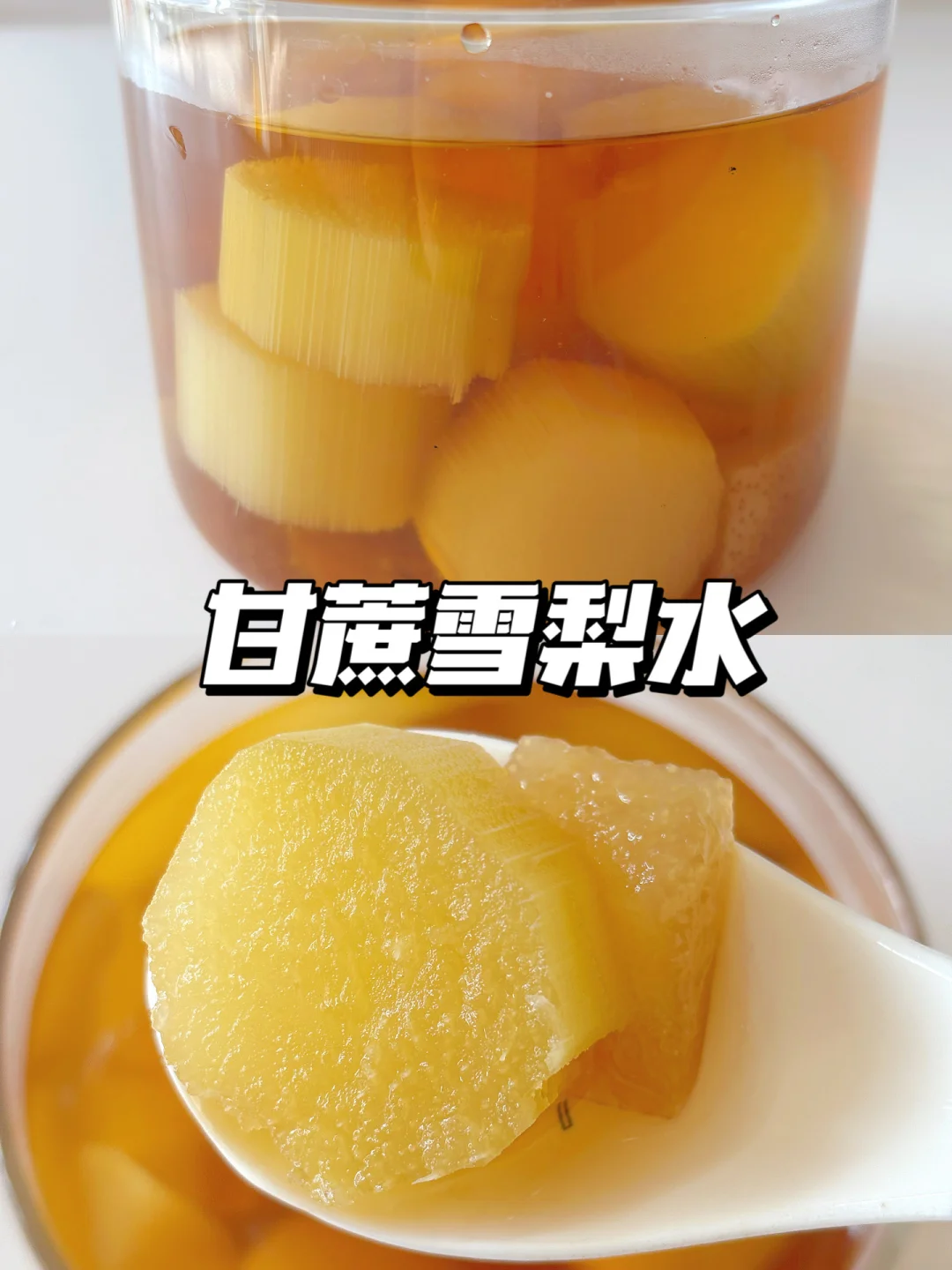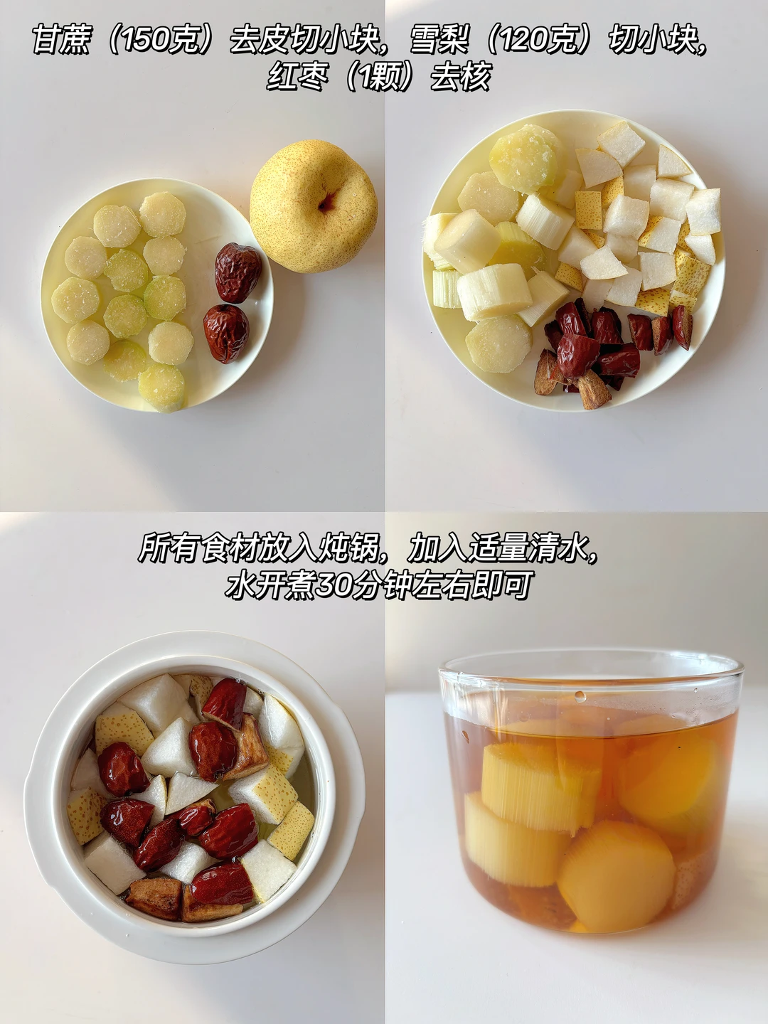 🌈滋养润肺,甘甜好喝~ 🎈准备食材: 1️⃣去皮甘蔗150克,雪梨一个(用120克),红枣一颗; 🎈制作步骤: 1️⃣甘蔗去皮切小块,雪梨用盐洗净后切块(保留果皮),红枣去核后剪小块; 2️⃣把食材倒入炖锅中(或者汤锅中),加入适量清水(按需添加),水开后再炖30分钟即可,出锅后可以根据需要适量加冰糖~