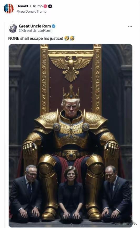 美国总统玩的越来越嗨了,美国总统特朗普发了一张图片,在图片当中,特朗普是王冠加身高高在上的王,而跪在他脚前的是几个跟他作对的民主党人,而且他给这幅图片起了一个标题:没有人能够逃离他的公正审判,特朗普俨然把自己当成了高高在上的王,公正无比的王,他要审判一切,审判一切反对他的人。