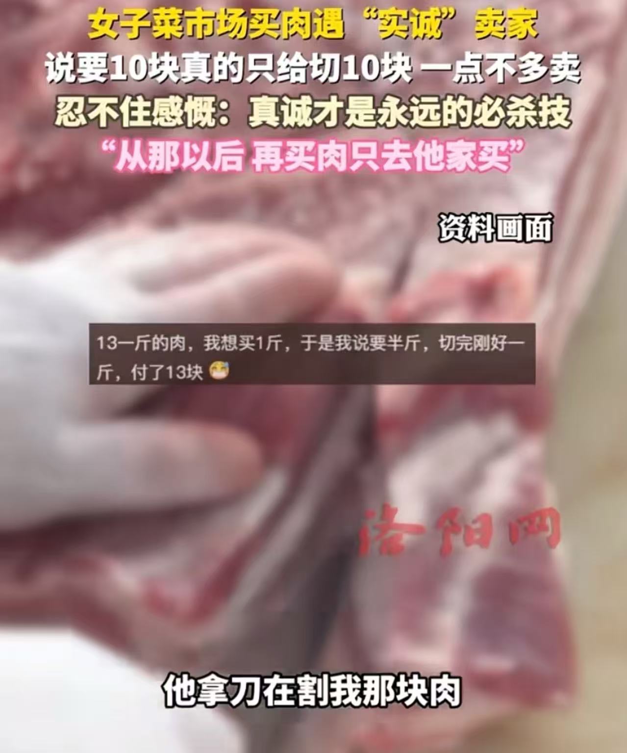 湖南,女子去买肉,提前说好买 10 块,但卖肉的大妈都会给她切 18 块甚至 20 块的肉。女子脸皮薄,大妈又说切下来之后就不好卖了,女子就只能认了!直到女子有一天换了一家卖肉的档口,忍不住感叹:真诚才是永远的必杀技!