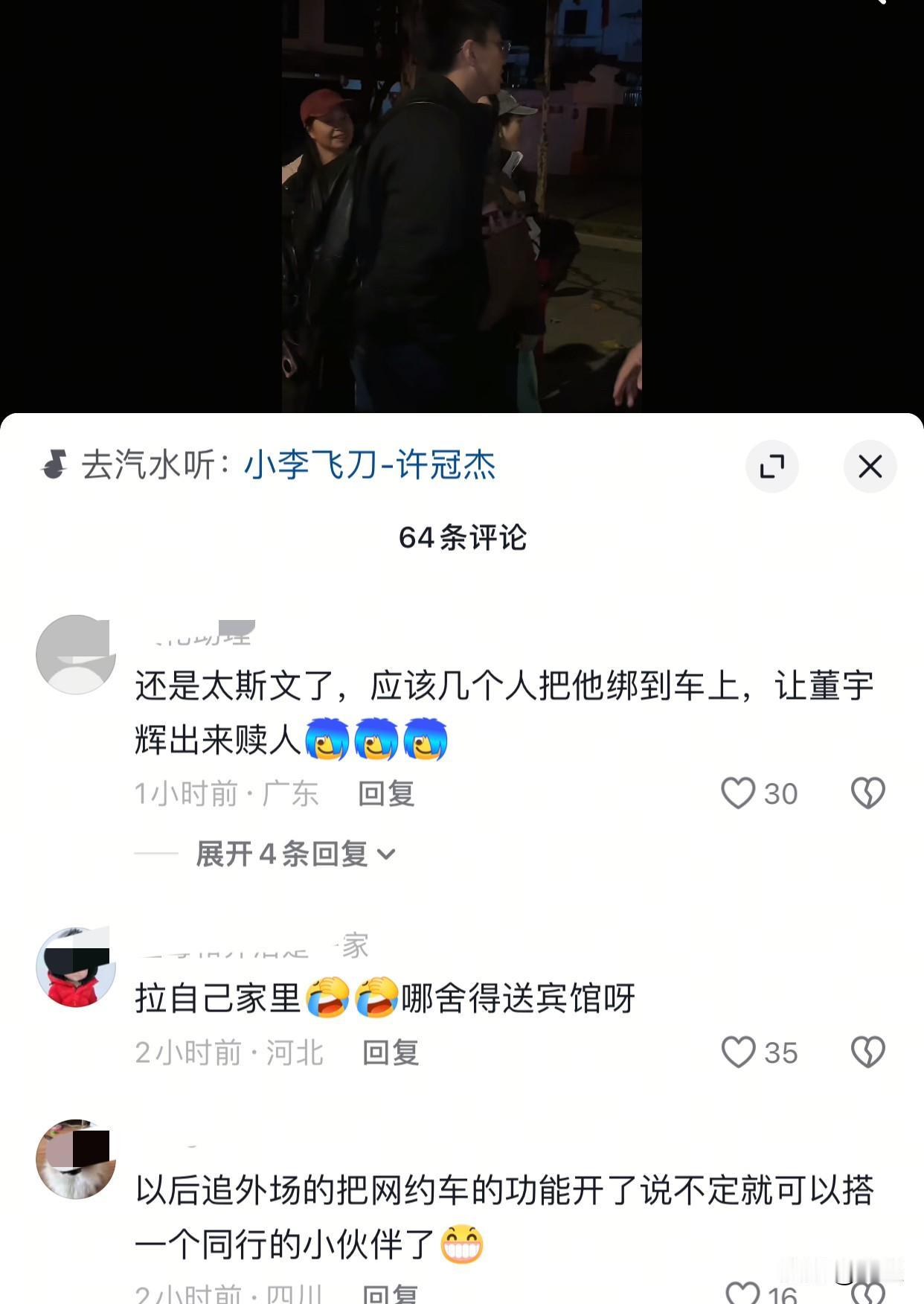 昨晚与辉同行安徽场直播结束 公司车不够了,马骞儿得打车回宾馆 被热心的宣城粉丝们围住 想送马骞儿他们回去 但他们应该有纪律不能坐 骞儿很礼貌的婉拒了 本来挺温馨的场面 结果一看评论区画风突变[笑哭] 有的说宣城粉丝太斯文了 应该直接绑走,让董宇辉来赎[捂脸] 有的说直接领回家 不舍得送宾馆。。。 还有的说马骞儿怕被劫所以才婉拒 不得不说这位网友真相了[偷笑] 与辉同行和粉丝们都好可爱 这就是因为一个人 喜欢了一整个团队吧 “爱屋及乌”具像化了[耶]