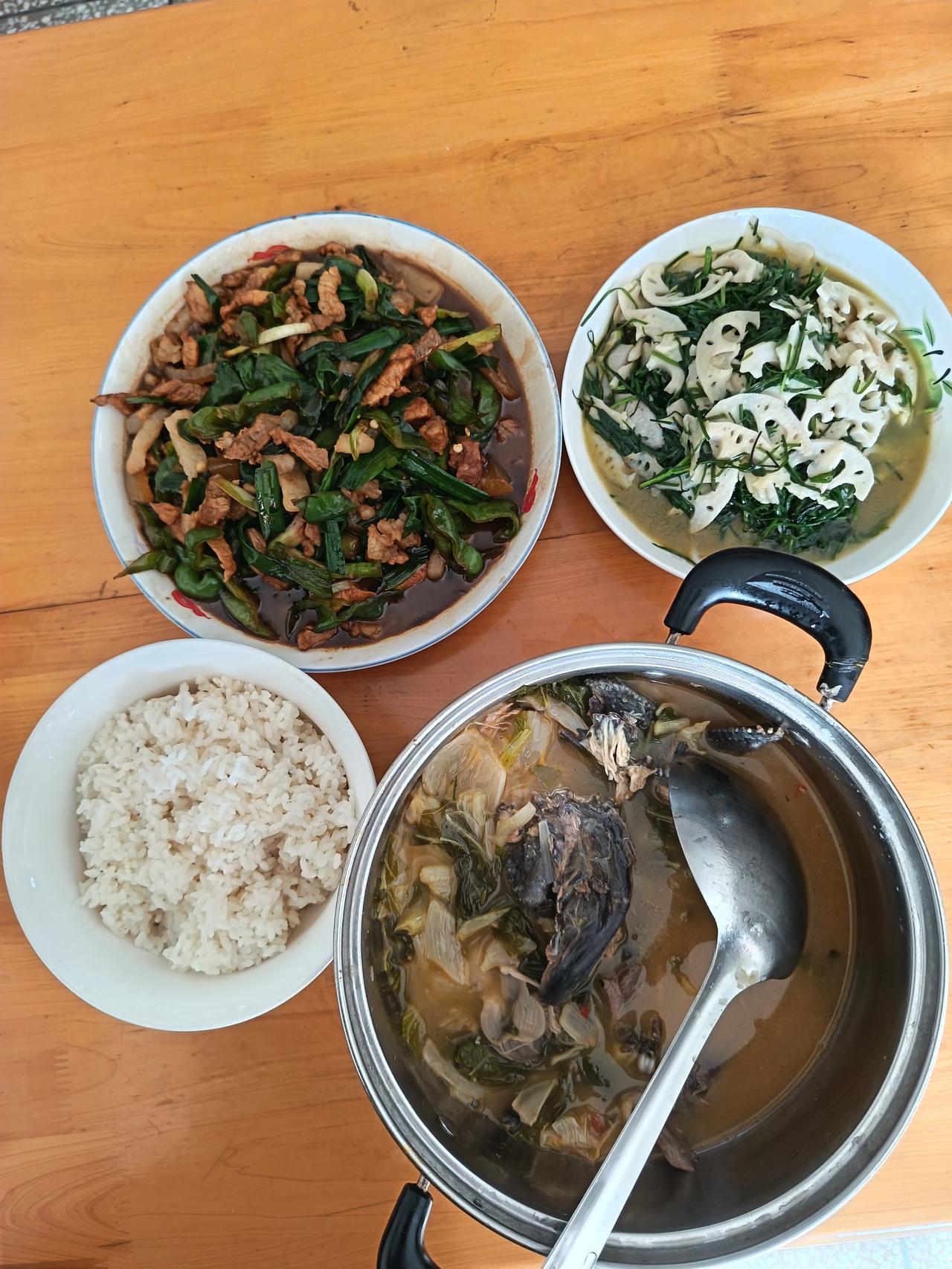 民以食为天!一顿不吃,心里饿的慌! 再忙也不能饿肚子。砍树枝忙到下午近一点,人困马乏的。我坐在椅上,一边歇着,一边掏出手机写了两个微头条,日常打卡不能忘。 老伴则去做饭,整了个青蒜炒肉丝,韭菜炒小藕,还有昨天的大白菜烩乌鸡,外加一个青萝卜豆腐汤(怕冷却没盛上桌)。再来上一碗大米饭,尽享人间烟火气!