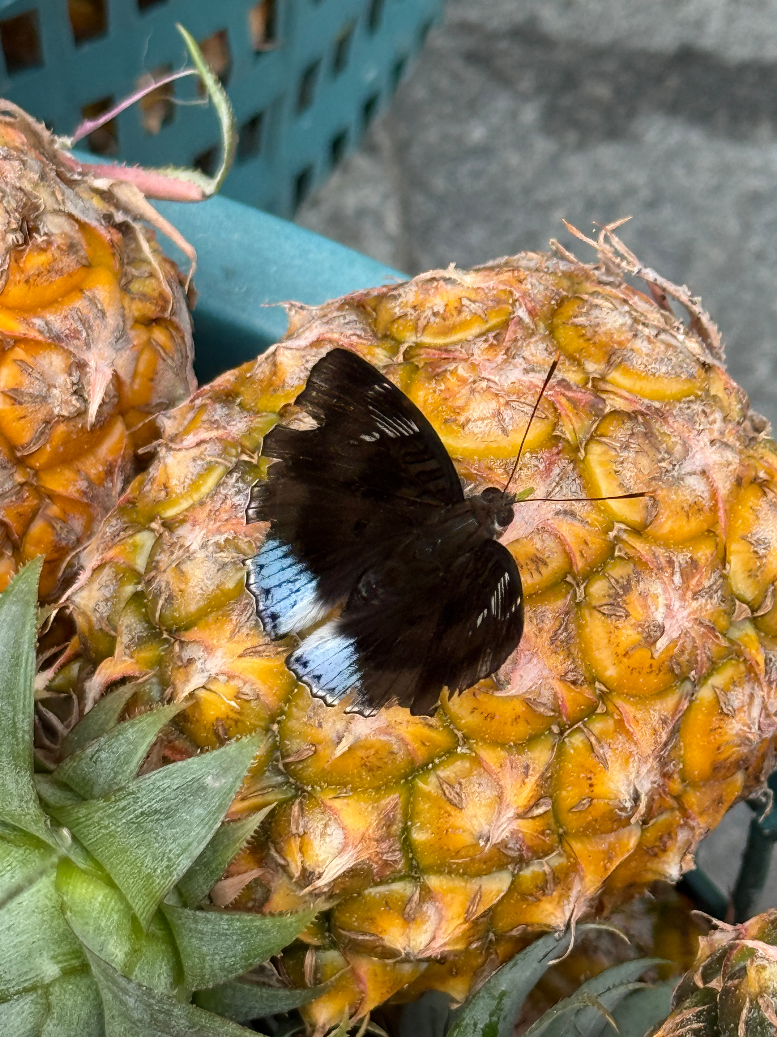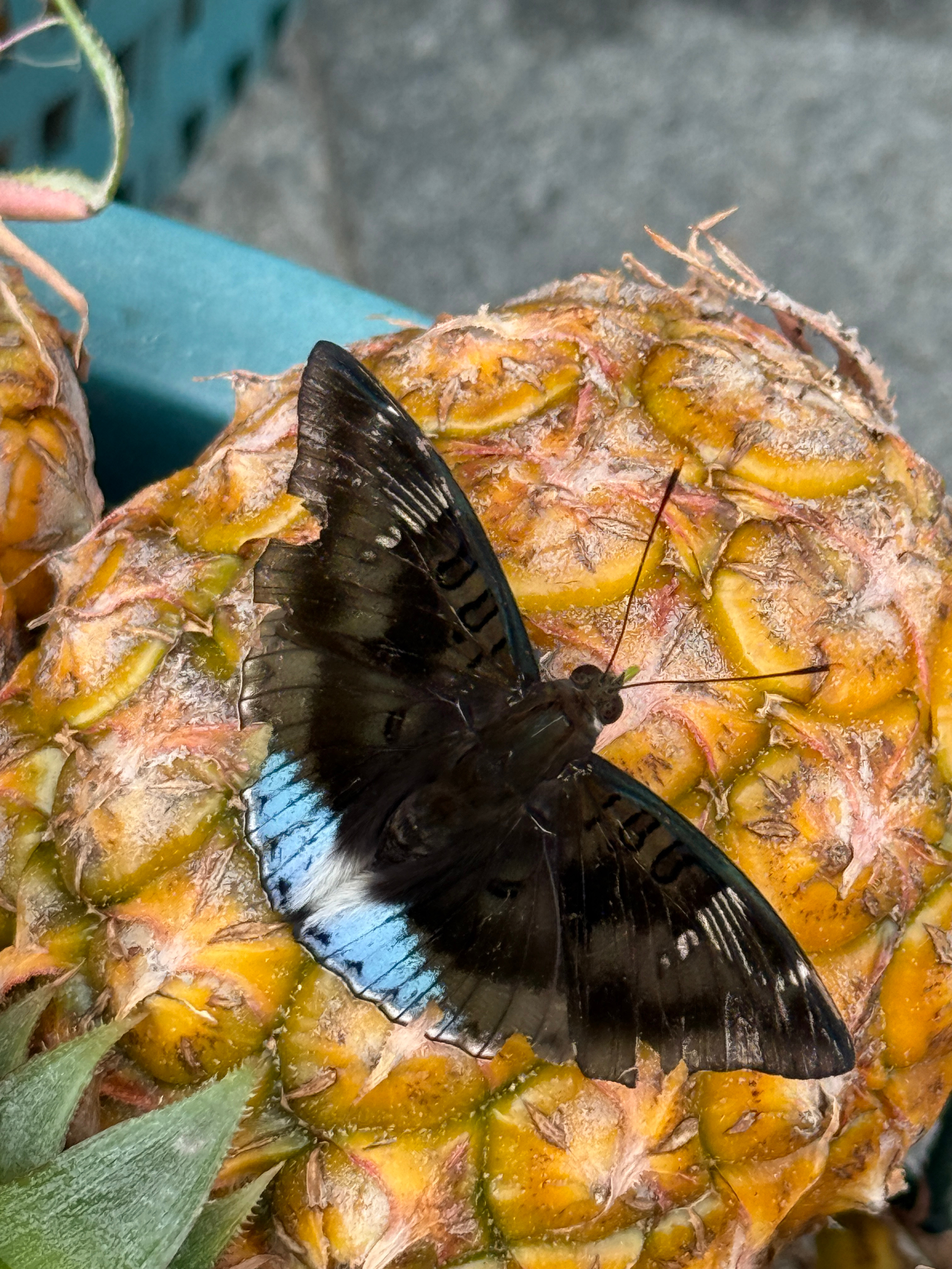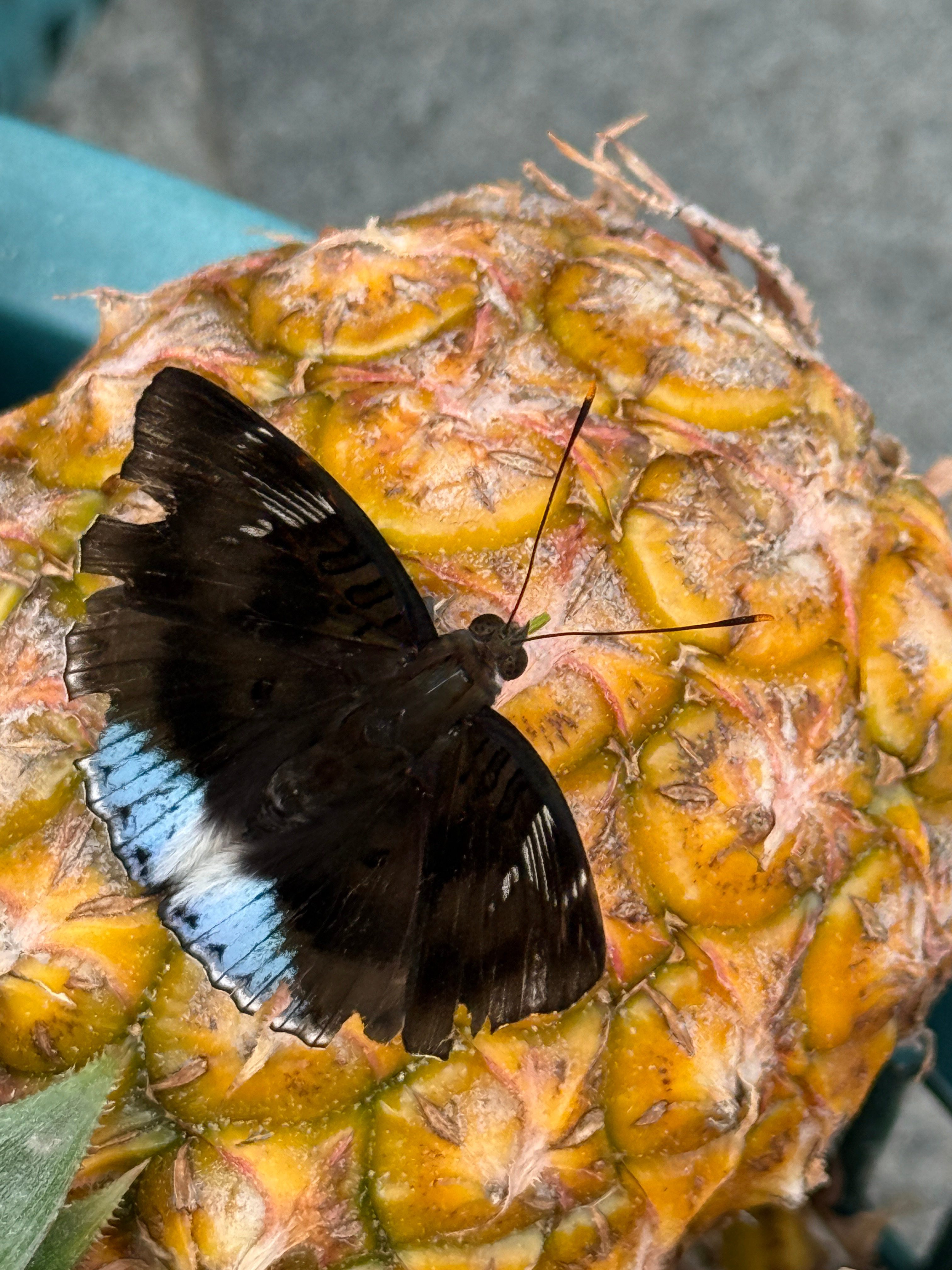 原来蝴蝶最爱吃的是菠萝呀,我还以为是花蕊 老板帮我拿菠萝的时候,蝴蝶飞走了,但是很快它又过来了