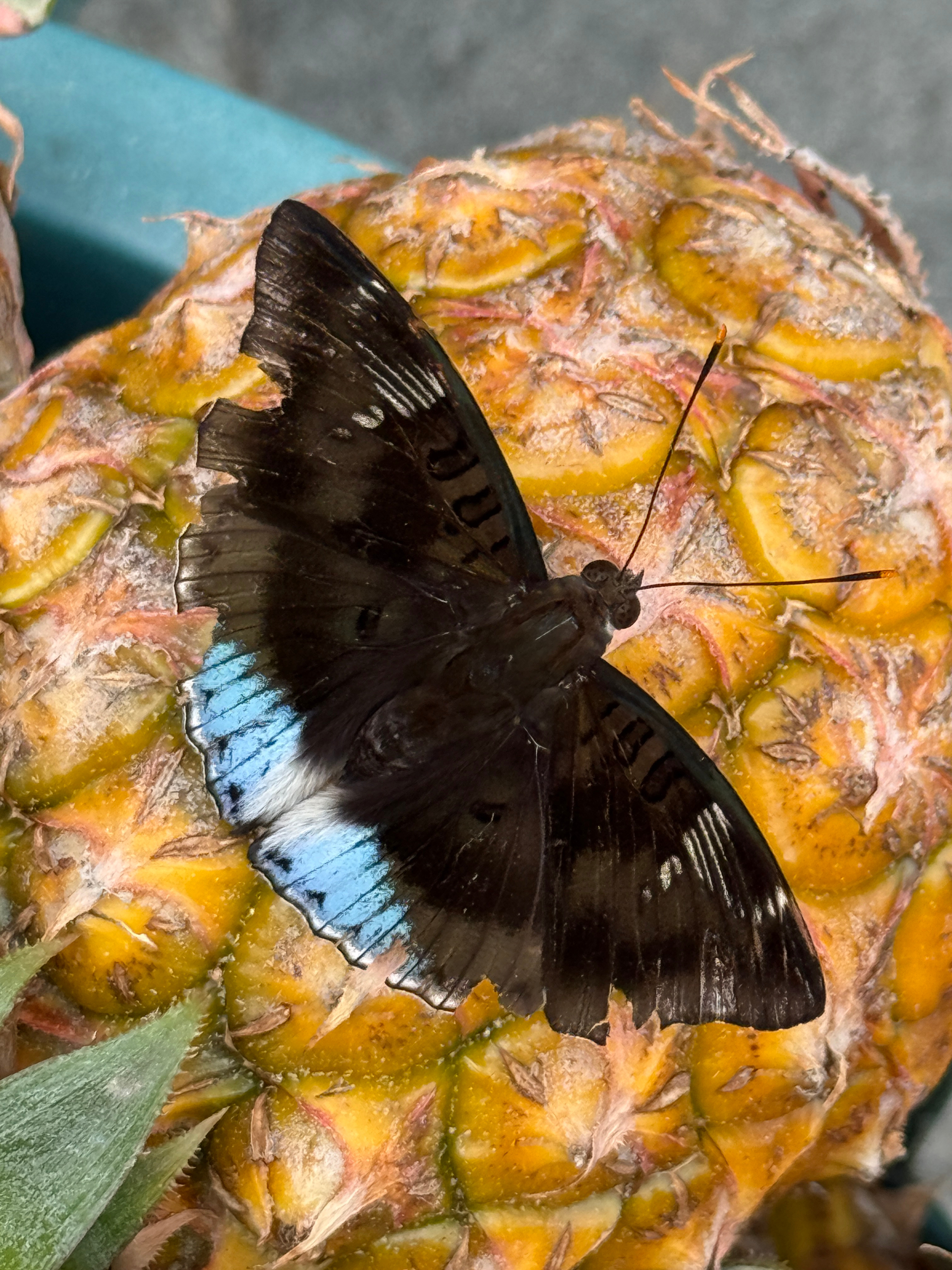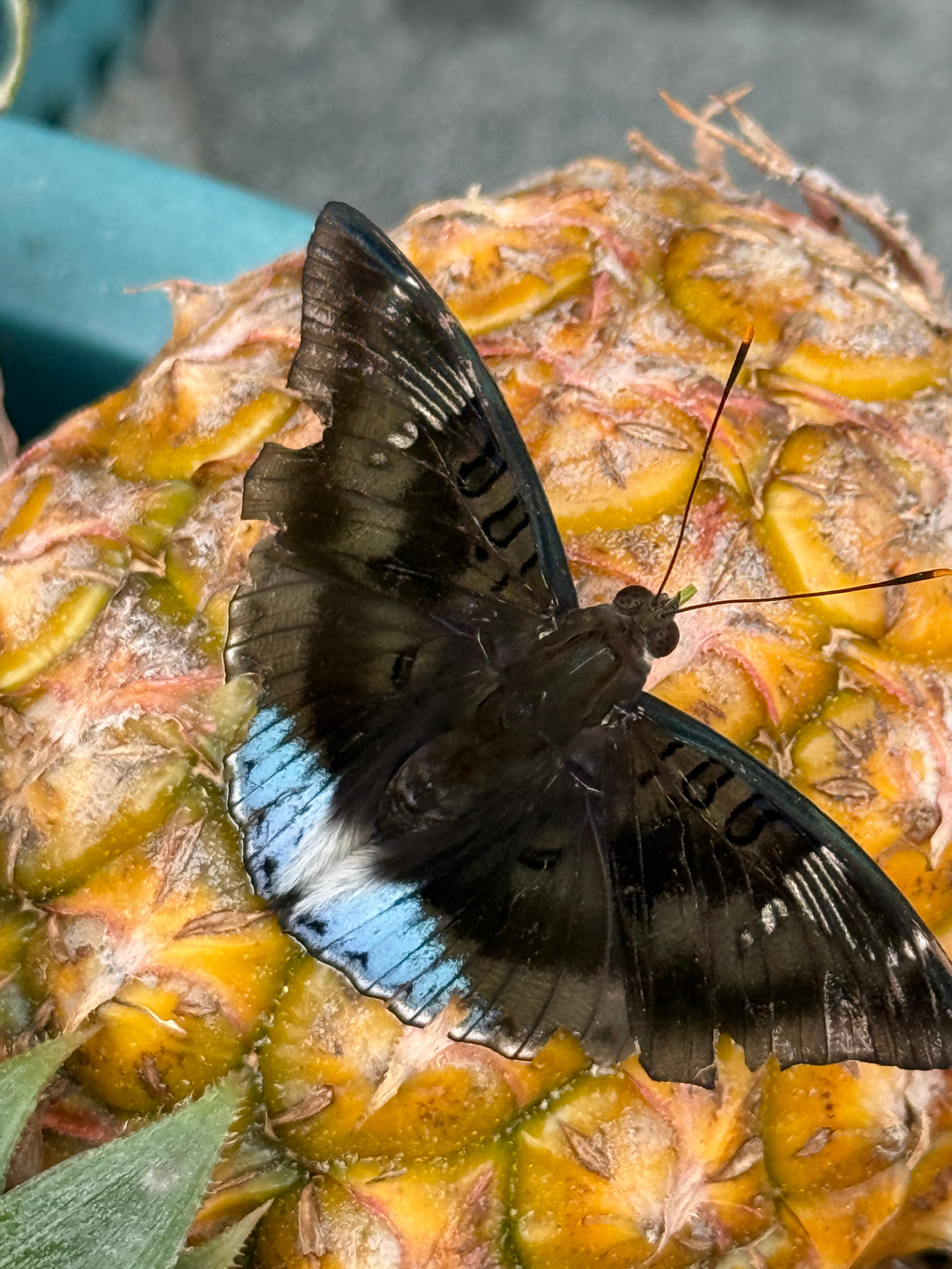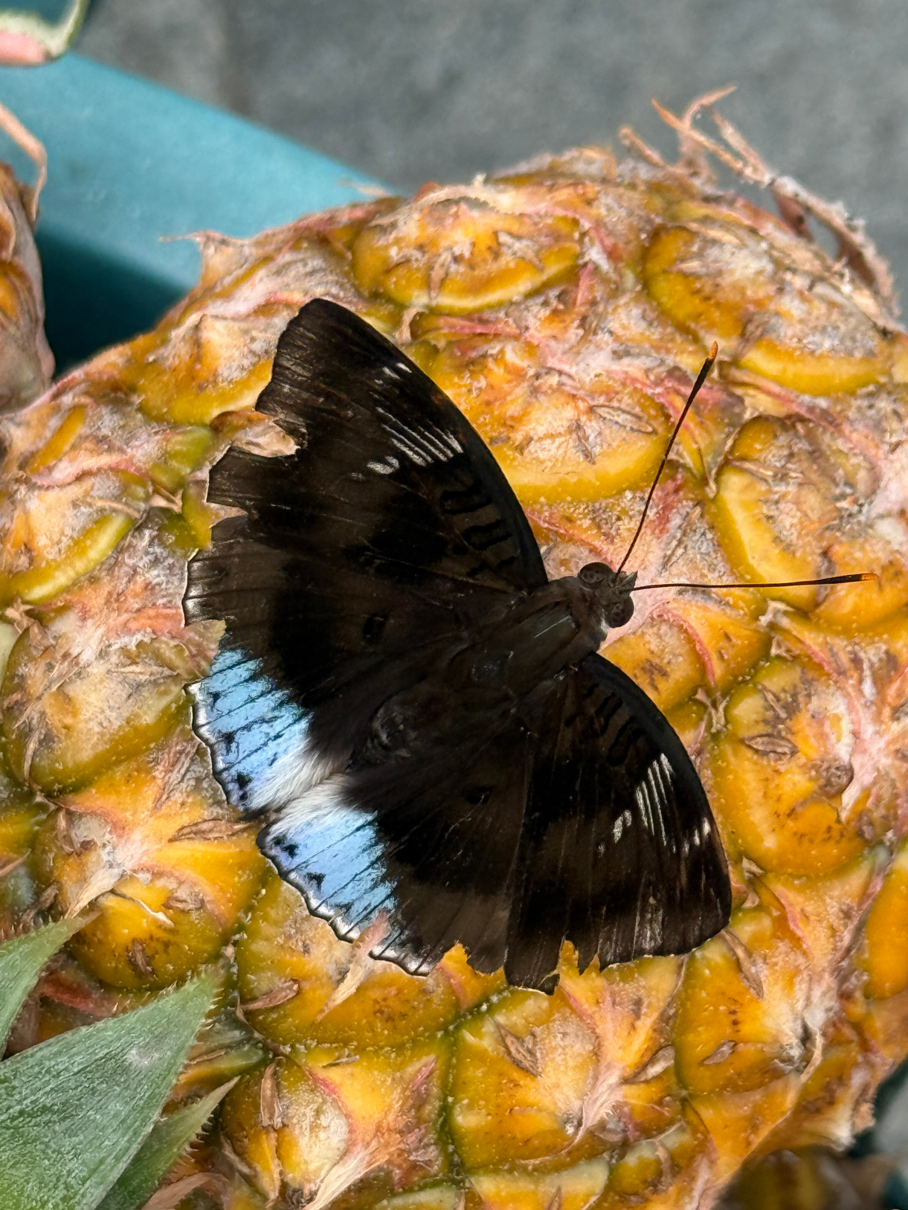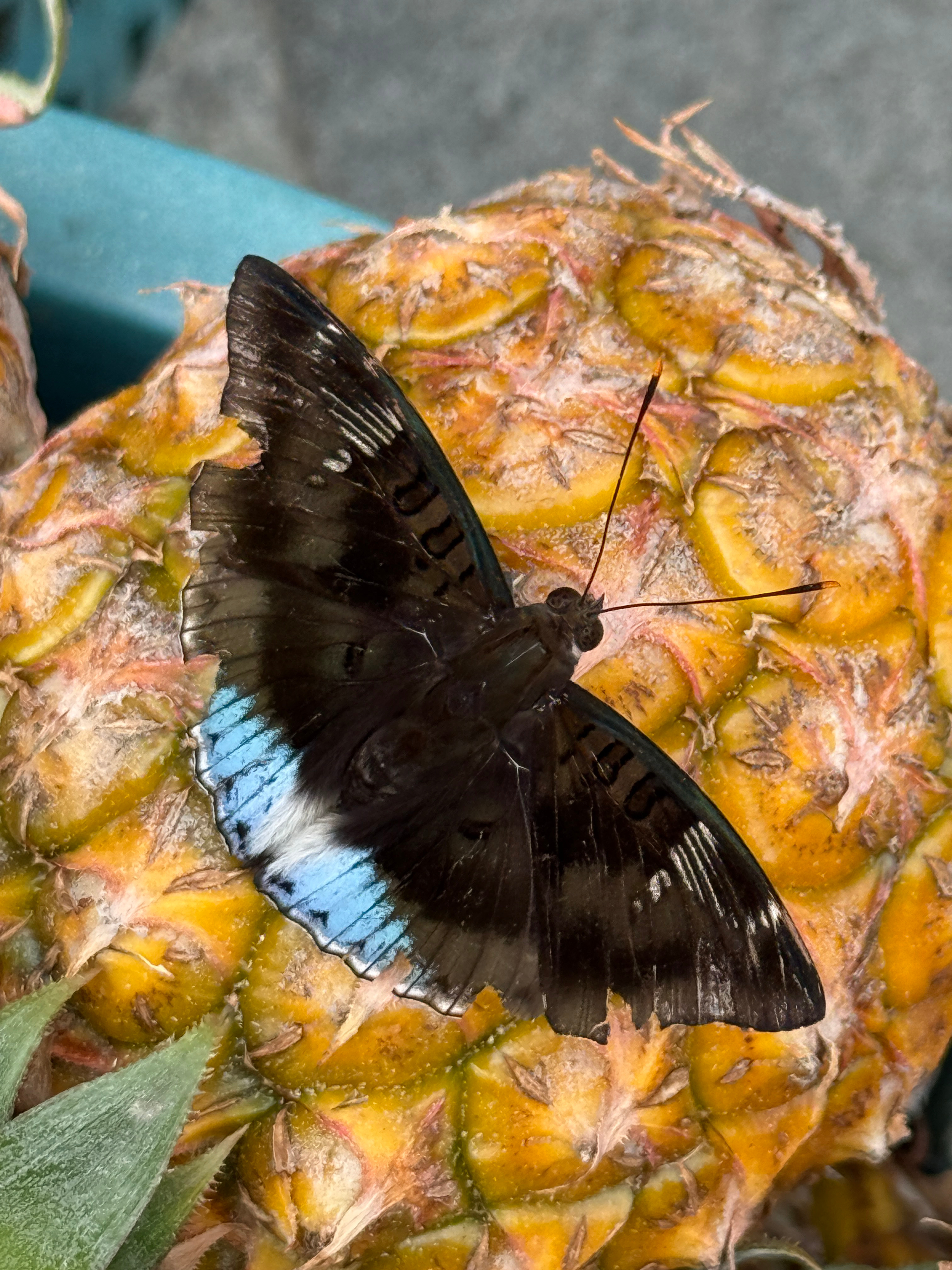原来蝴蝶最爱吃的是菠萝呀,我还以为是花蕊 老板帮我拿菠萝的时候,蝴蝶飞走了,但是很快它又过来了