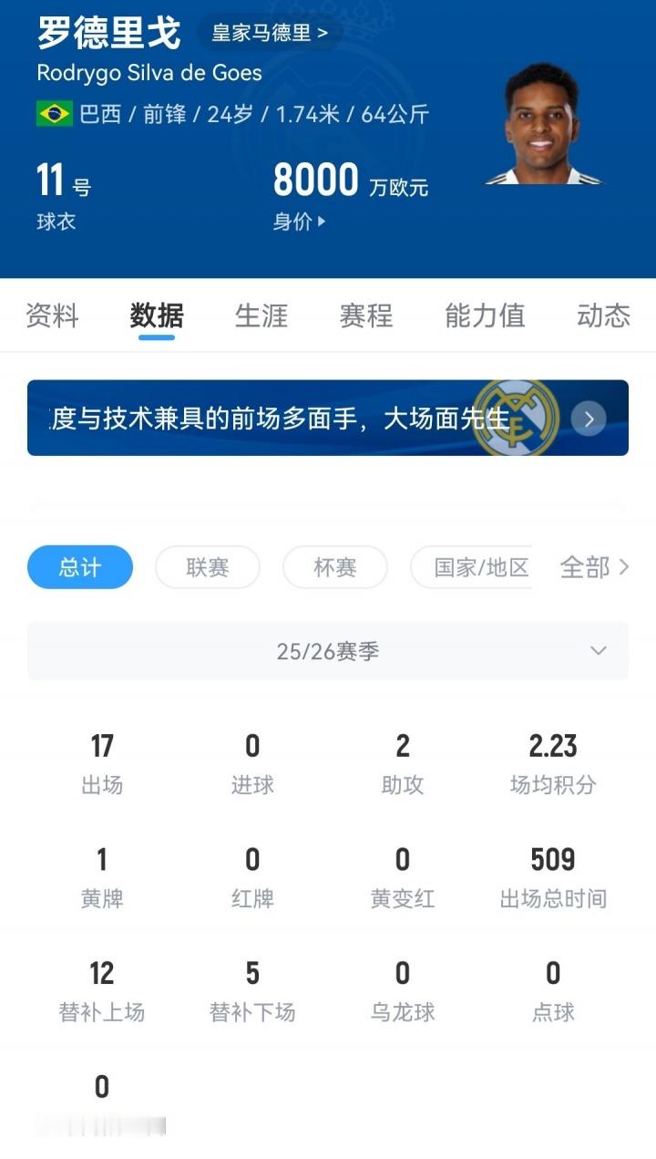 标价1亿...罗德里戈在皇马丢主力+29场球荒,近半年仅友谊赛进2球 凌晨西甲皇马2-2战平埃尔切,罗德里戈获得了久违的首发机会,但他在第57分钟就被换下场,延续了在俱乐部的进球荒。上赛季姆巴佩加盟后皇马锋线竞争加剧,罗德里戈的出场时间和状态都不再稳定,而在阿隆索执教后,罗德里戈的出场时间再度减少,今年世俱杯皇马6场比赛,罗德里戈仅出场93分钟。今年夏天,罗德里戈多次出现转会传闻,曼城、利物浦、拜仁都曾与他传出绯闻,但皇马1亿欧的要价吓退了几乎所有球队。外加罗德里戈也没有坚定离队的决心,他最终还是在夏窗结束后留在了皇马,但目前他在球队的处境仍然糟糕。自今年3月欧冠1/8决赛首回合对阵马竞进球后,罗德里戈共代表皇马参加了29场正式比赛,没有收获任何进球,助攻也仅有3次。在过去的半年时间里,罗德里戈参加正式比赛仅在国家队友谊赛对阵韩国时打入两球。本赛季至今,罗德里戈为皇马出战14次共计416分钟,仅有4次首发,送出2次助攻,目前德转身价8000万欧。