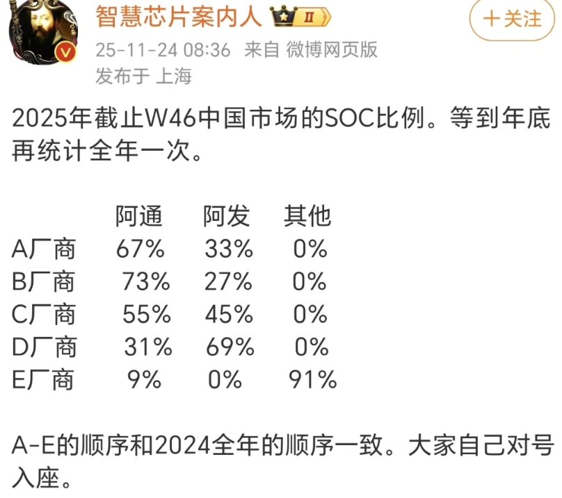 国内这五家手机厂商,除了最后一个,其他四家都对高通联发科依赖度很高啊。 这里面最后一个肯定就是华为了,使用了高通9%的芯片,用在了上半年发布的活力版上。 相比之下其他四家里面为啥其他这一列全都是0呢?按理来说小米的玄戒芯片也装机开售了的…