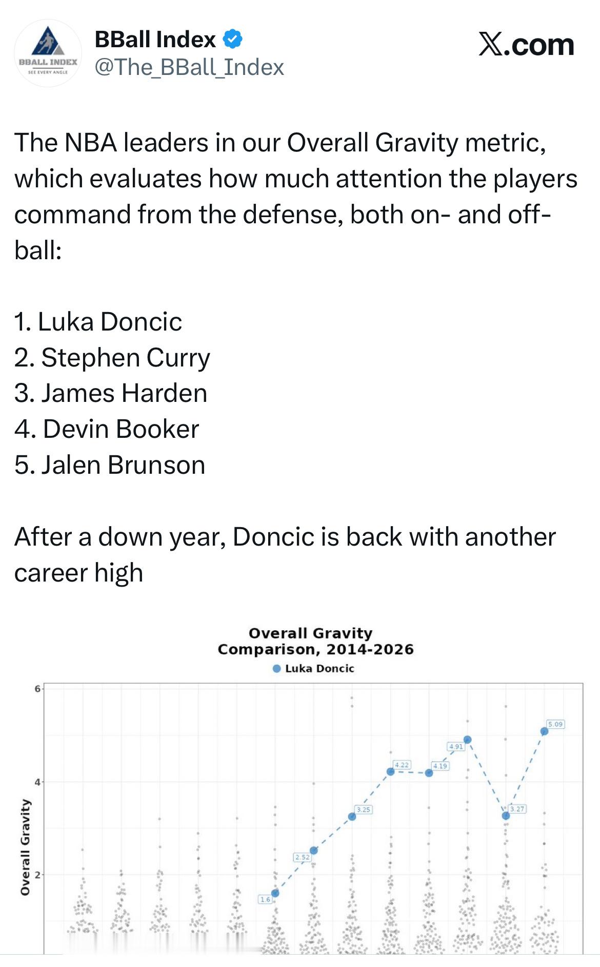 以下是本赛季的“综合引力(Overall Gravity)”指标中领跑NBA的球员。该指标评估了球员在有球和无球状态下,对防守端吸引了多少注意力:1. 卢卡·东契奇(Luka Doncic)2. 斯蒂芬·库里(Stephen Curry)3. 詹姆斯·哈登(James Harden)4. 德文·布克(Devin Booker)5. 杰伦·布伦森(Jalen Brunson)