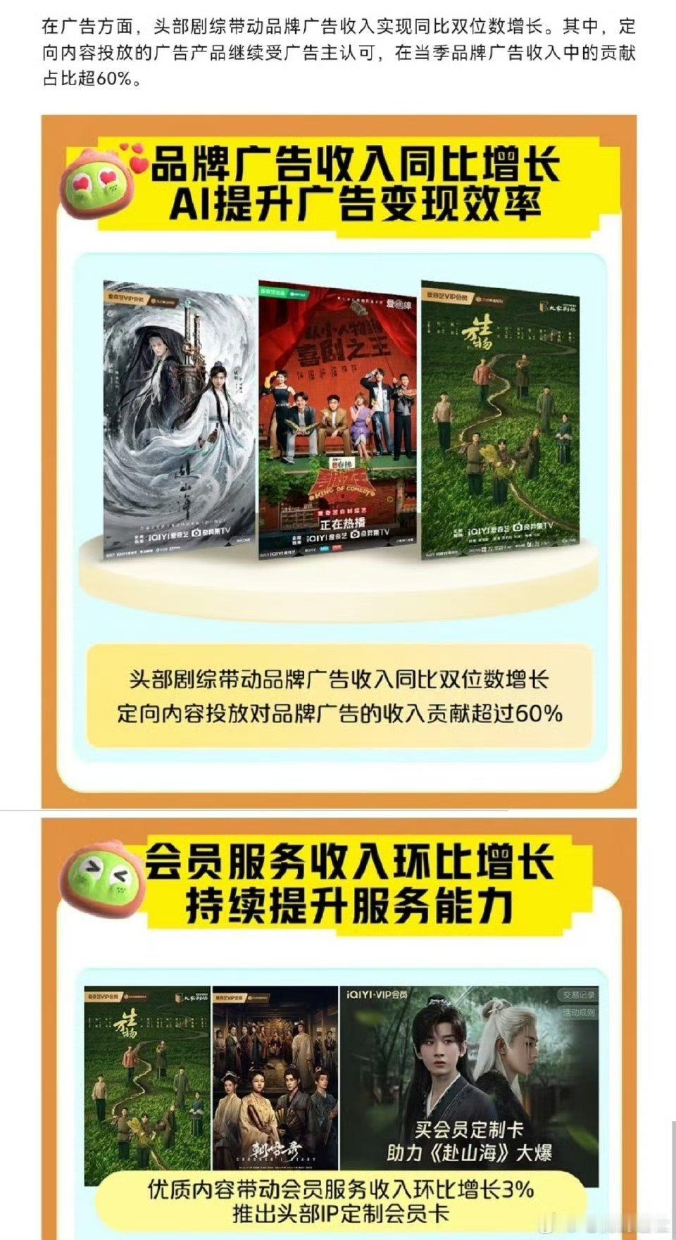 爱奇艺2025Q3财报:提到了四部剧哎🏆《生万物》网台双爆,成全民爆款,2025年单日云合热播榜市占率第一,并创下央八集均收视新高;🏆暑期档《朝雪录》《生万物》内容热度值均破万,《不眠日》内容热度峰值超8800;🏆《生万物》《朝雪录》带动会员收入,《赴山海》合作推出定制会员卡,带动会员收入;🏆《朝雪录》《不眠日》《赴山海》带动超点;🏆《赴山海》《生万物》带动品牌广告收入;