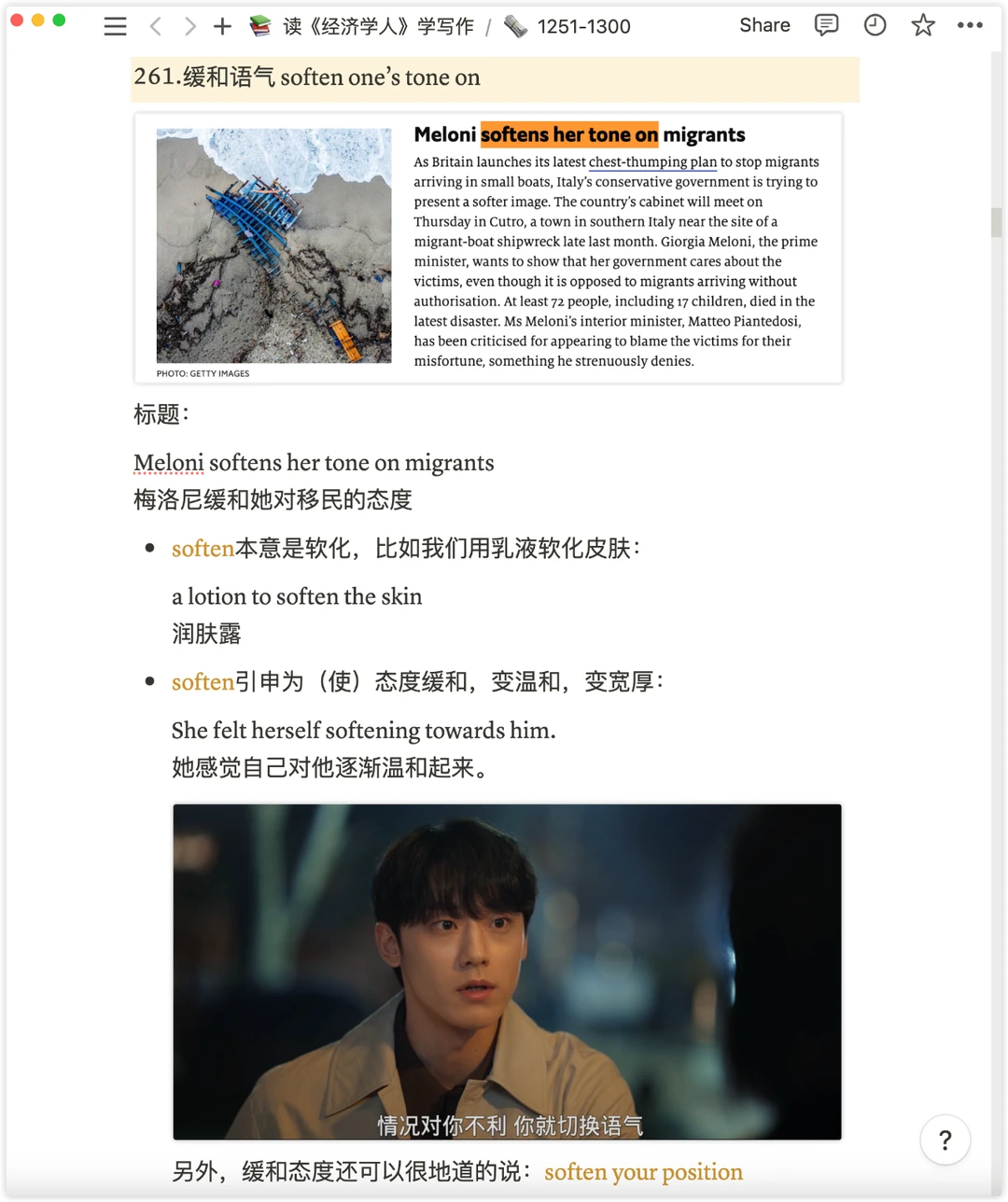 1️⃣ soften本意是软化,比如我们用乳液软化皮肤: a lotion to soften the skin 润肤露 2️⃣ soften引申为(使)态度缓和,变温和,变宽厚: She felt herself softening towards him. 她感觉自己对他逐渐温和起来。 3️⃣ 缓和态度还可以很地道的说:soften your position