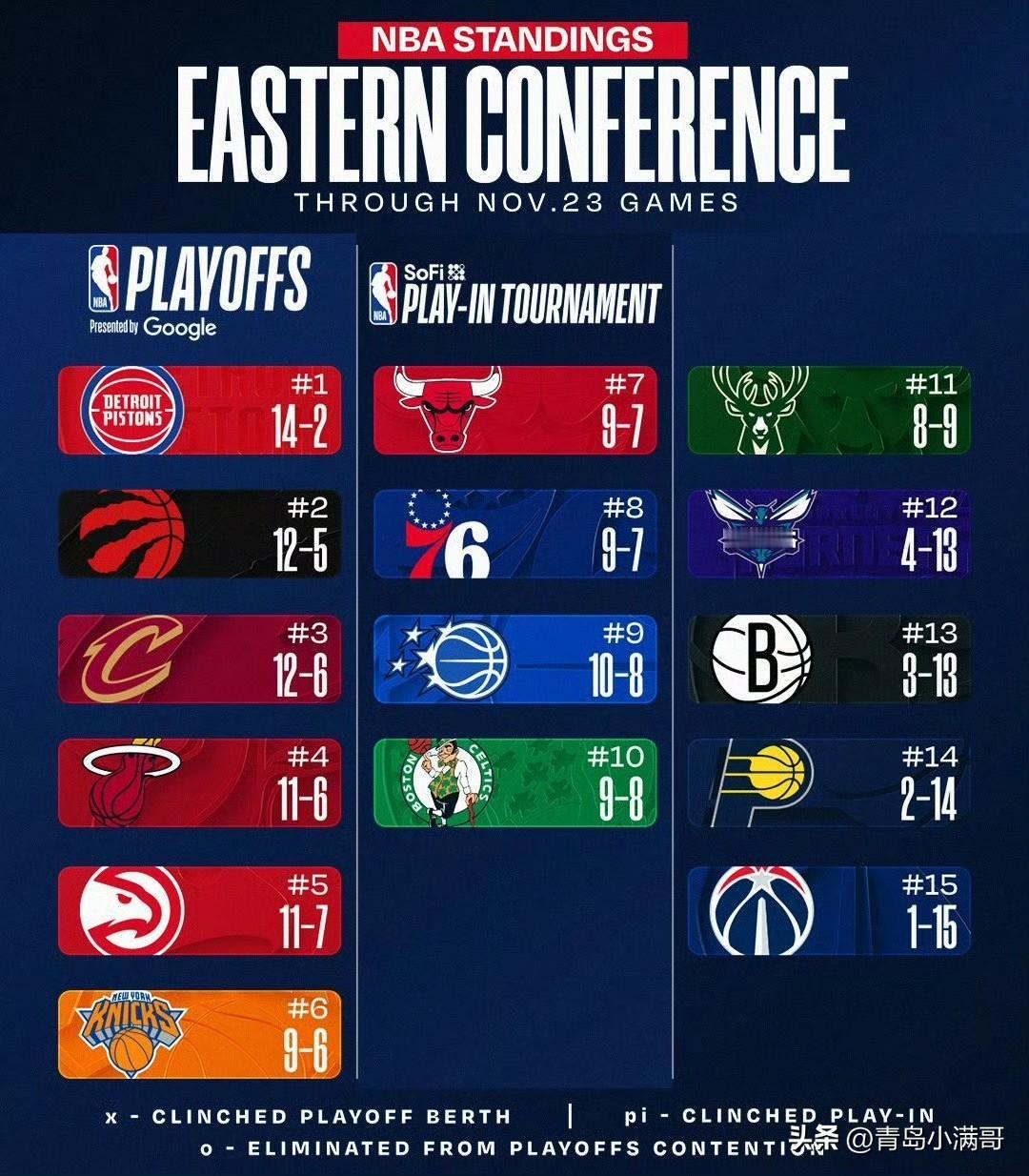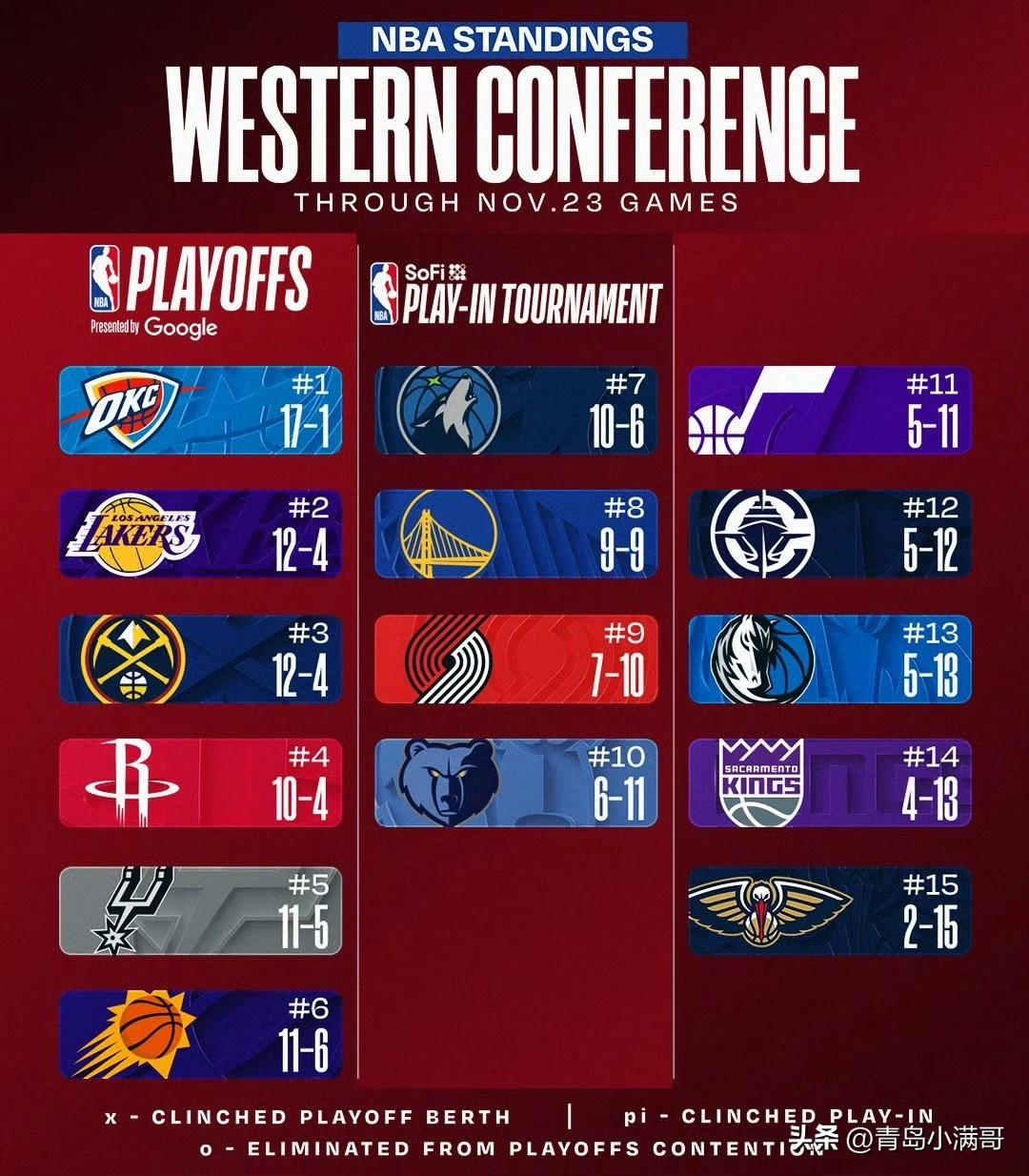 NBA东西部局势!!!东西部最新排名,雷霆9连胜,湖人升至第二! 北京时间11月24日,一天的比赛又结束了,今天是周一,八场比赛都还是很精彩的,一起来看下比赛后各支球队的最新排名。 东部方面: 活塞继续第一,猛龙战胜篮网保持第二,骑士战胜快船排名第三,热火战胜76人排名第四,76人第八,老鹰胜黄蜂排名第五,尼克斯排名第六,凯尔特人战胜魔术排名第十,魔术第九。 西部方面: 雷霆轻松战胜开拓者排名第一,开拓者第九,湖人胜爵士排名升至第二,太阳战胜马刺排名第六,马刺第五,快船输球排名第十二。 今天比赛不算太多,明天才是重头戏,明天共有10场比赛,超级比赛日将会非常精彩,大家记得锁定喜欢的比赛记得观看。 NBA实力榜 nba新赛程 nba最终排名 nba每日战况 西部常规赛排名