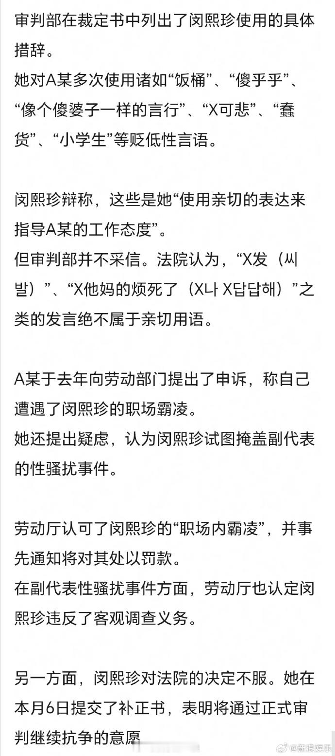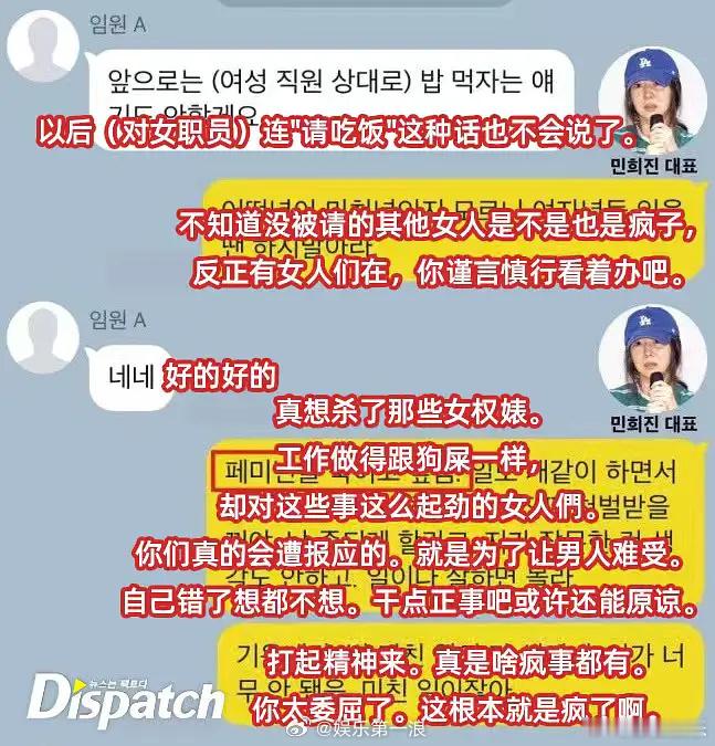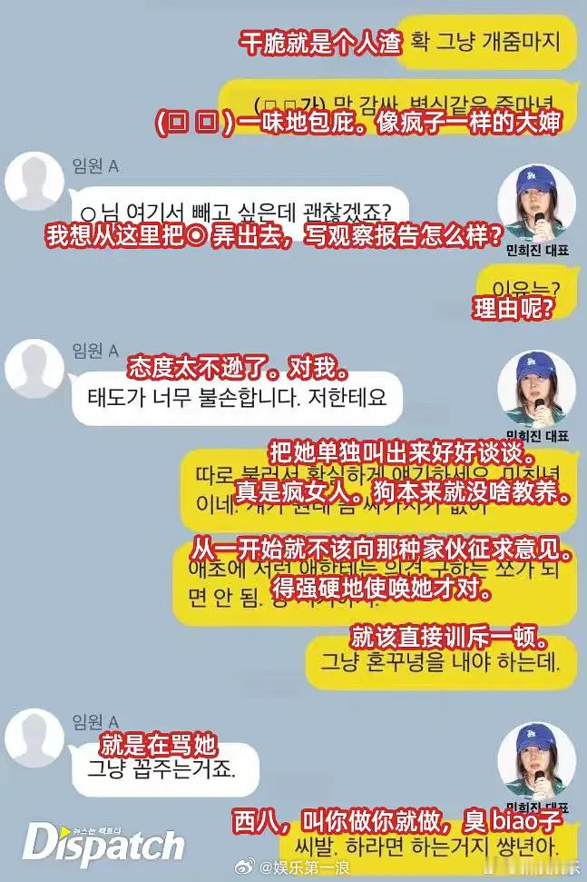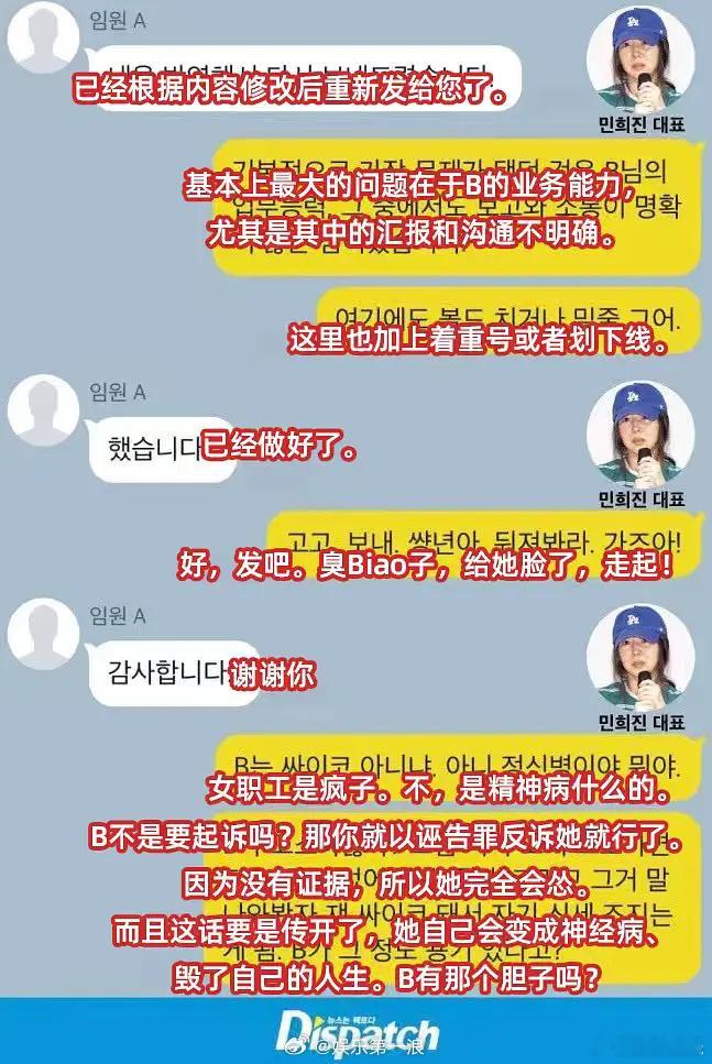 24日,D社曝光了闵熙珍职场霸凌案的判决书。判决书中写到闵熙珍在群聊中反复使用嘲讽性语言,如“饭桶”、“傻子”、”说话没脑子”、“蠢货”等,闵熙珍则辩解称这是“为了指导A某得工作态度,而使用的亲切表达”,但法院并未采纳这一说法。