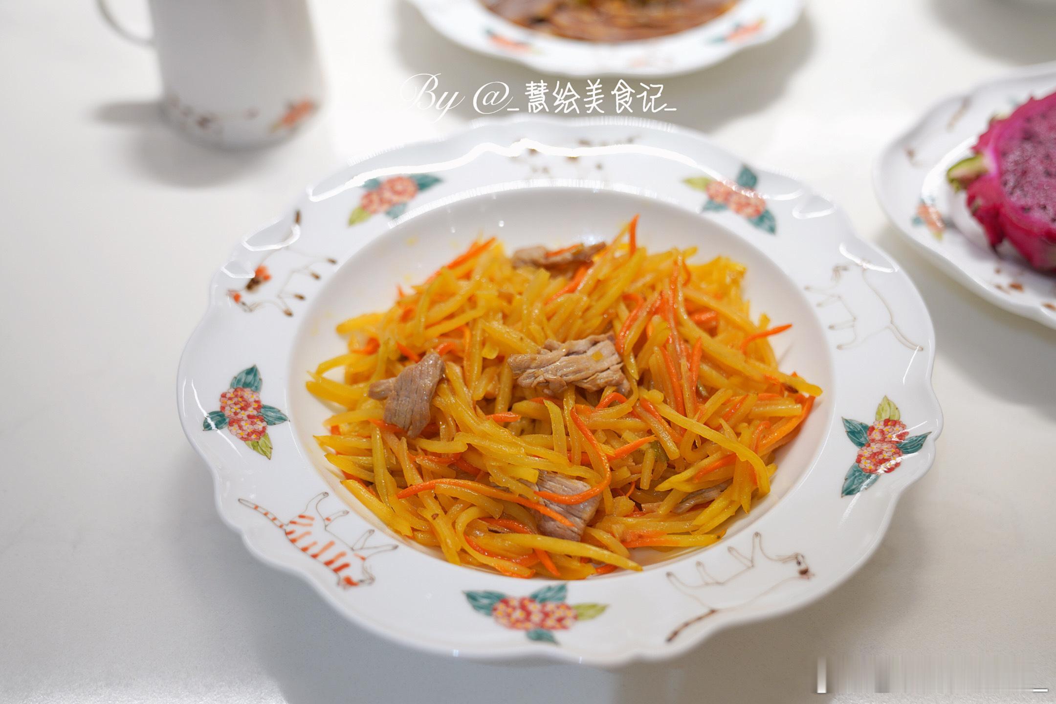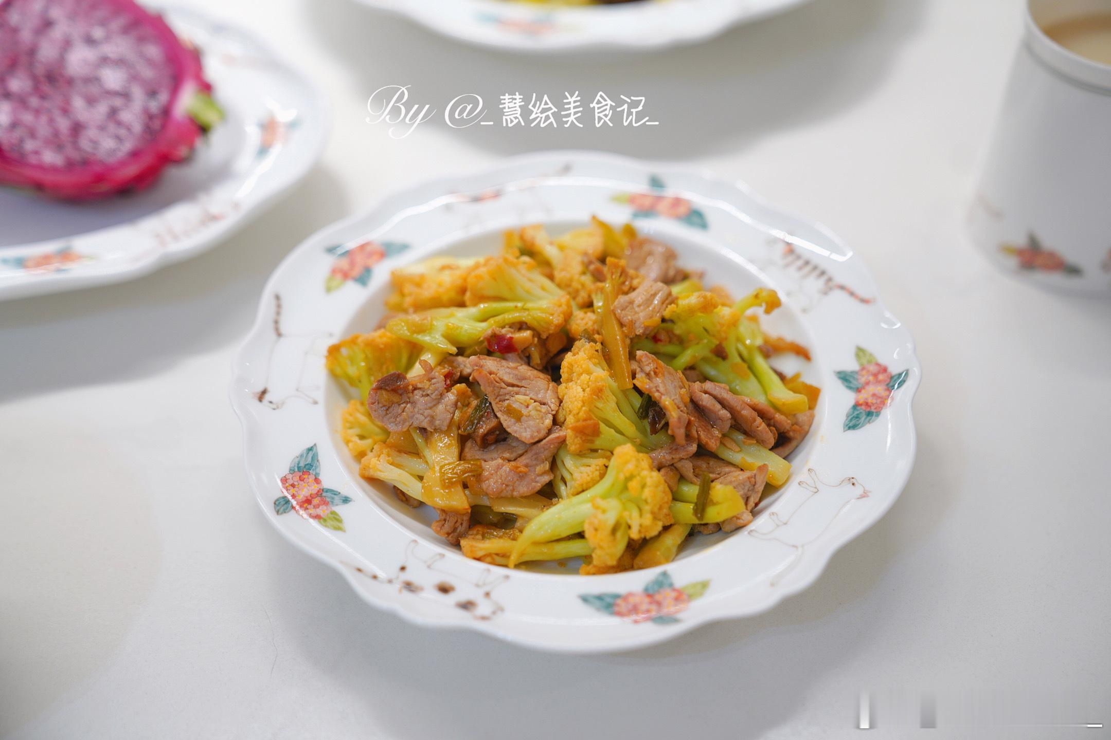 吃晚饭炒三丝、花菜炒肉、莴笋炒木耳、卤牛肉、红薯粥、燕麦豆浆、火龙果~