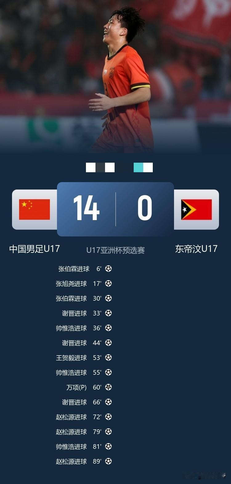 久违的大胜,U17国足14-0狂胜东帝汶! 在刚刚结束的U17亚洲杯预选赛A组第二轮比赛中,U17国足面对鱼腩东帝汶终于踢出来久违的大胜,全场比赛国足射门次数28-1,射正次数20-1,控球率73%-27%,角球7-0,可以说完全把东帝汶当做小学生踢了。 最终中国7名球员取得进球,三人帽子戏法,一人梅开二度,最终以14-0狂胜东帝汶,排名小组第一。 中国足球还是有希望的,国足也不是一无是处,总能给球迷带来惊喜,相信未来的国足也会越来越好的。