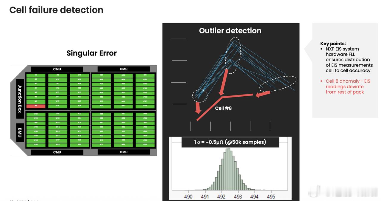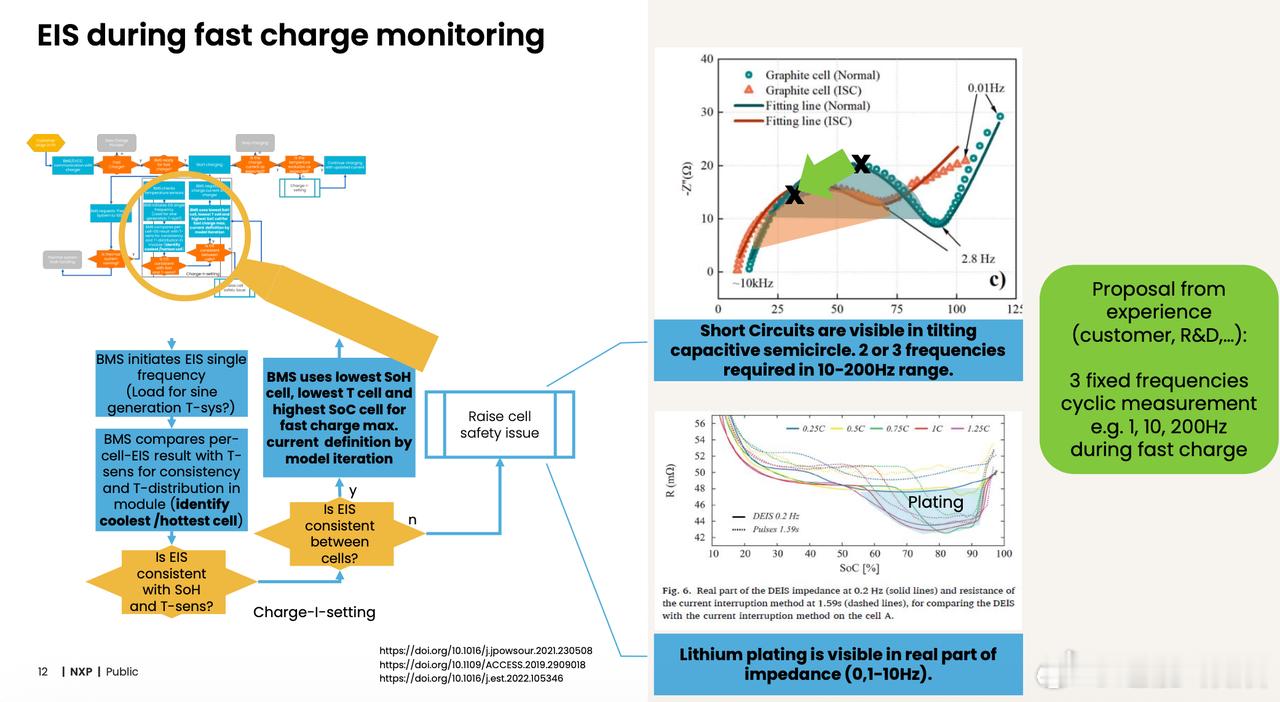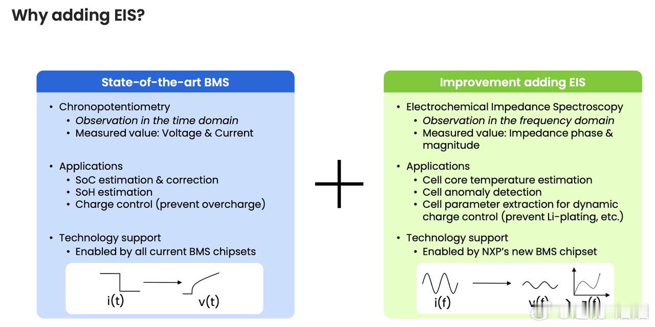 NXP 推出业界首款 EIS 增强型 eisBMS 芯片组,让实验室级电化学检测技术落地车载。传统 BMS 仅能被动监测电压温度,而 EIS 技术通过纳秒级同步检测,深入电芯内部分析阻抗变化,精准捕捉锂沉积、内部短路等隐患,提前数小时预警。适配 800V 架构,支持 17 分钟快充(9%-80% SOC),无需大幅改动硬件即可升级,推动 BMS 从 “表面监测” 向 “深层分析” 跨越,平衡快充效率与电池安全~