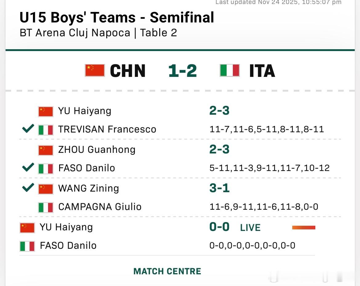 U15男团半决赛🇨🇳中国1-2意大利🇮🇹王梓宁3比1朱利奥·坎帕尼亚(1