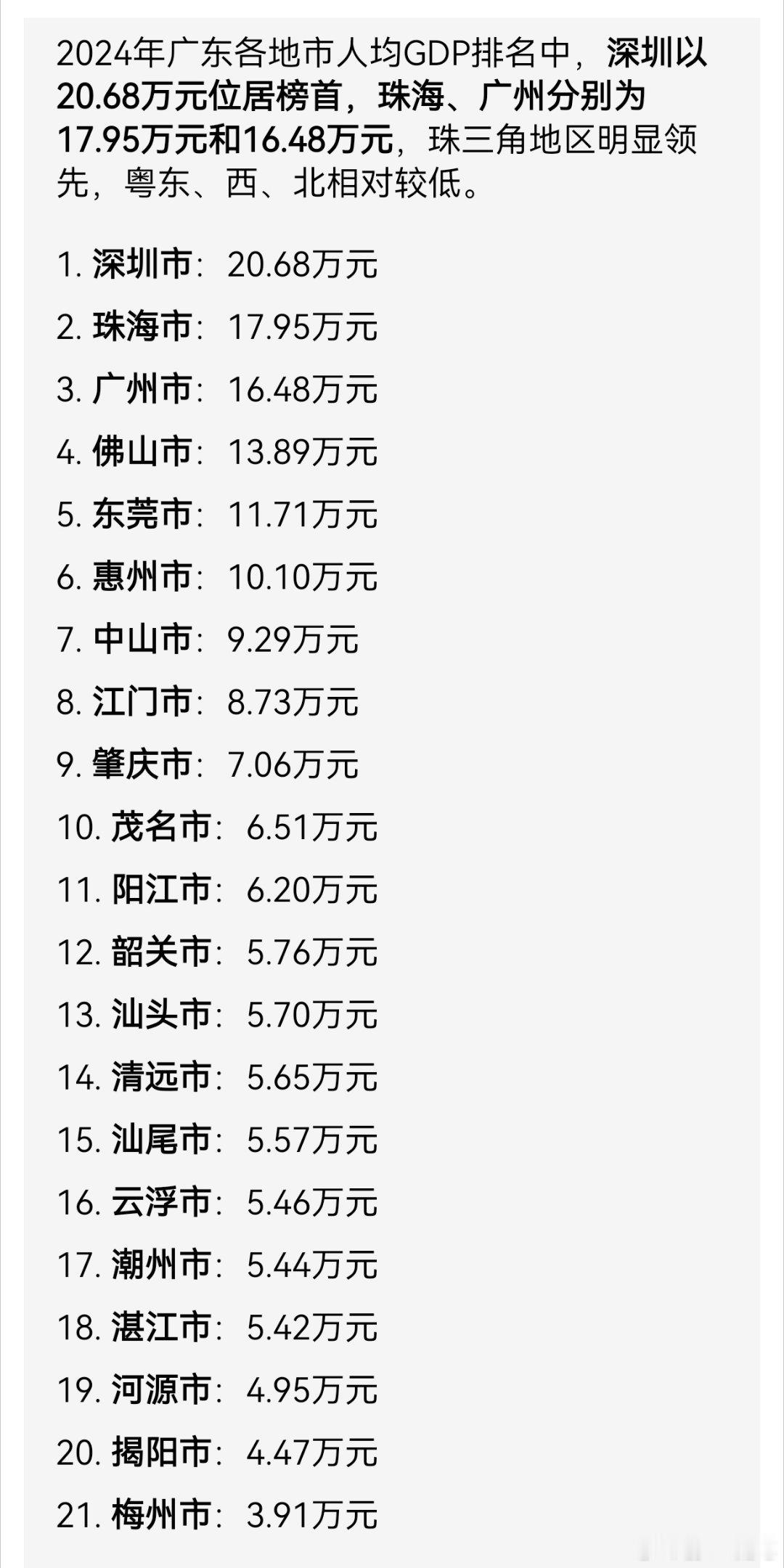 深珠通道设计很牛,直接建公铁两用通道要超越深中通道了,汽车和高铁各行其道,主打双用通道模式。地点是从深圳前海到珠海高新区,用时仅30分钟。珠三角珠江西岸发展出现很多问题,包括属于珠三角九市的中山、江门和肇庆人均GDP都不如全国平均水平了,真的丢人啊。尤其大名鼎鼎的中山市,沦落到这个地步,令人惊讶。广东珠三角3个地市人均不如全国,21个地市,15个不如全国平均水平,广东发展内部分化太严重。广东的上缴纳税外调比江浙比例高也是一个关键。