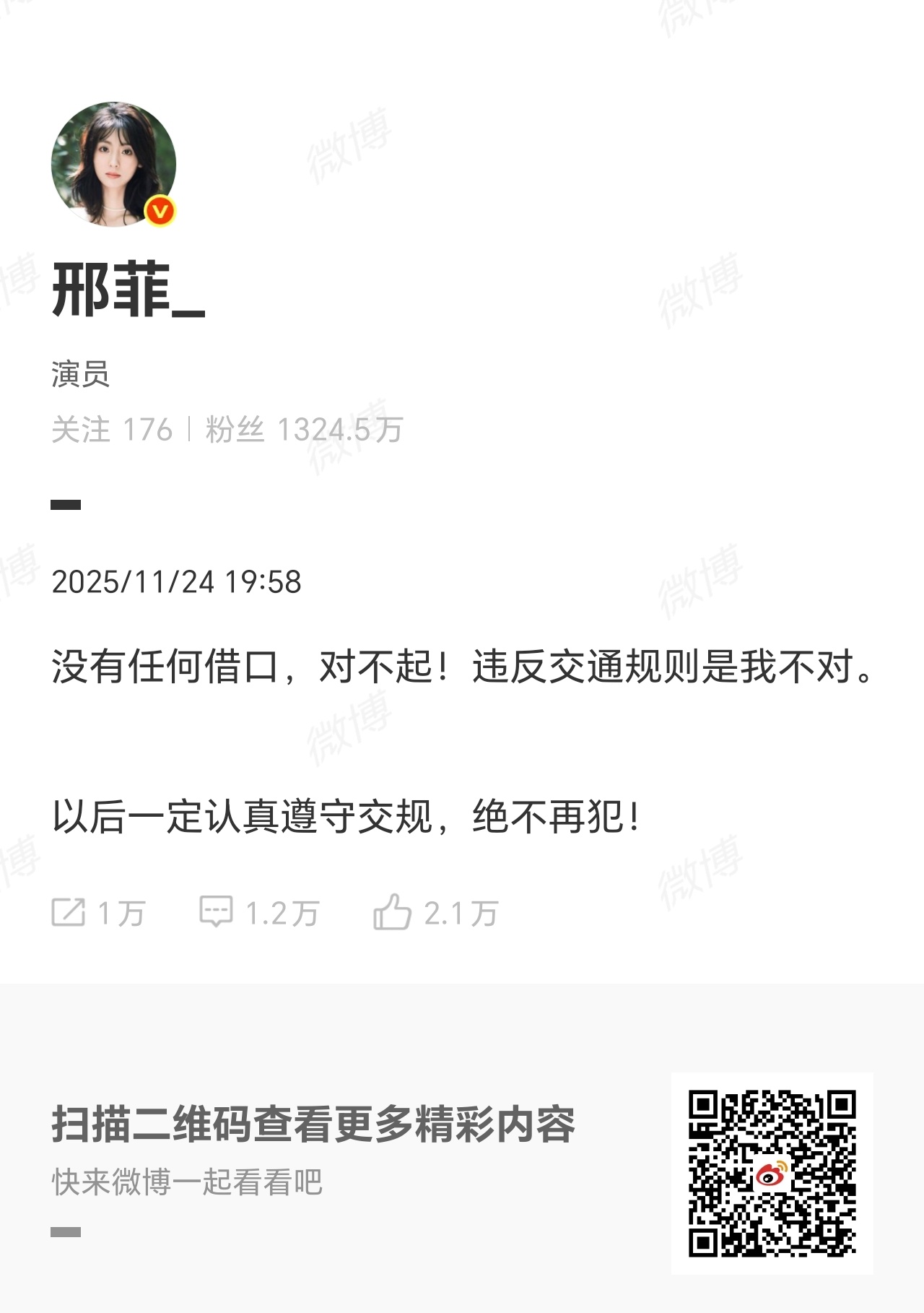 11月24日晚,话题登上热搜。随后, 发文致歉:“没有任何借口,对不起!违反交通规则是我不对。以后一定认真遵守交规,绝不再犯!”