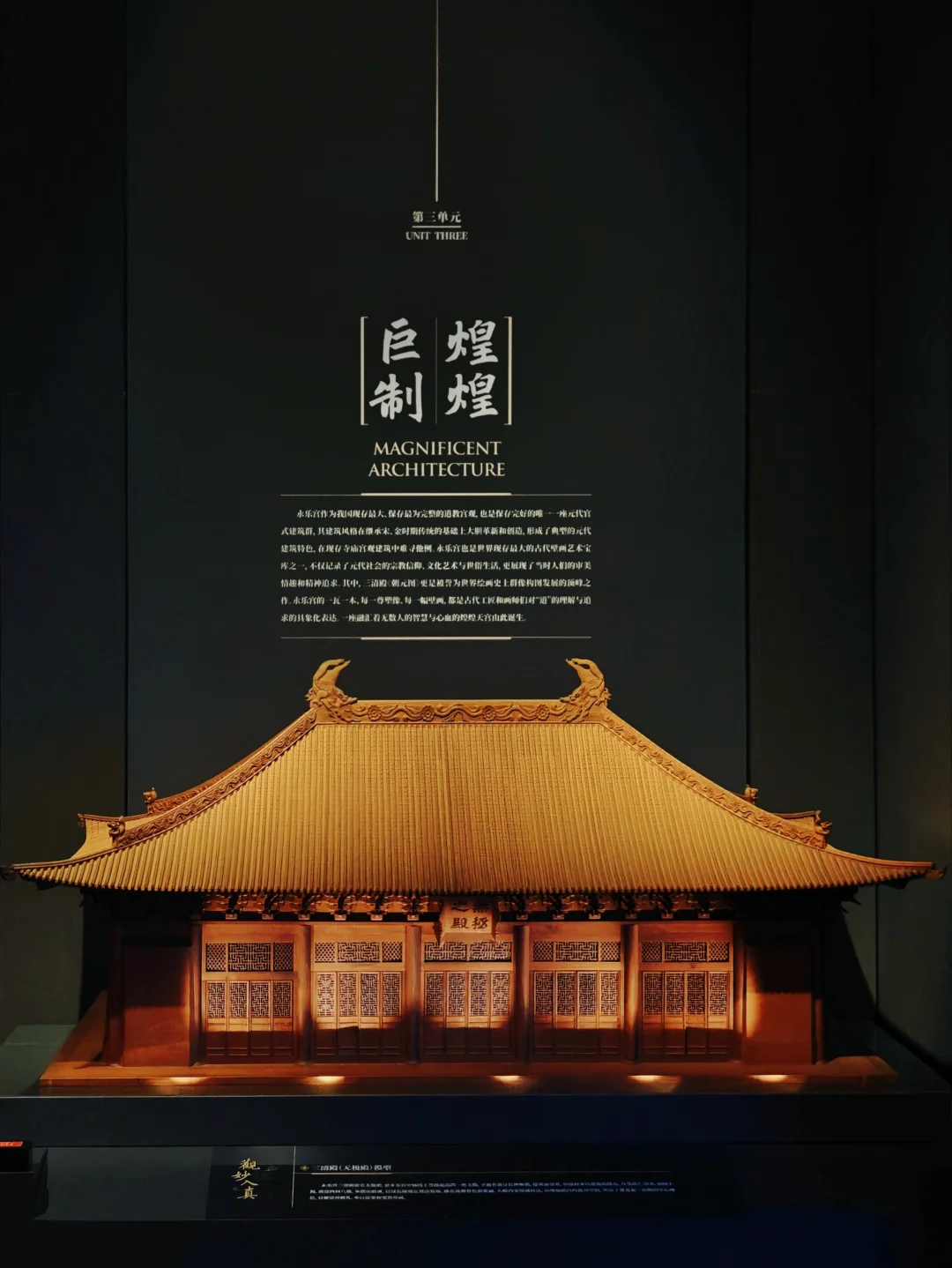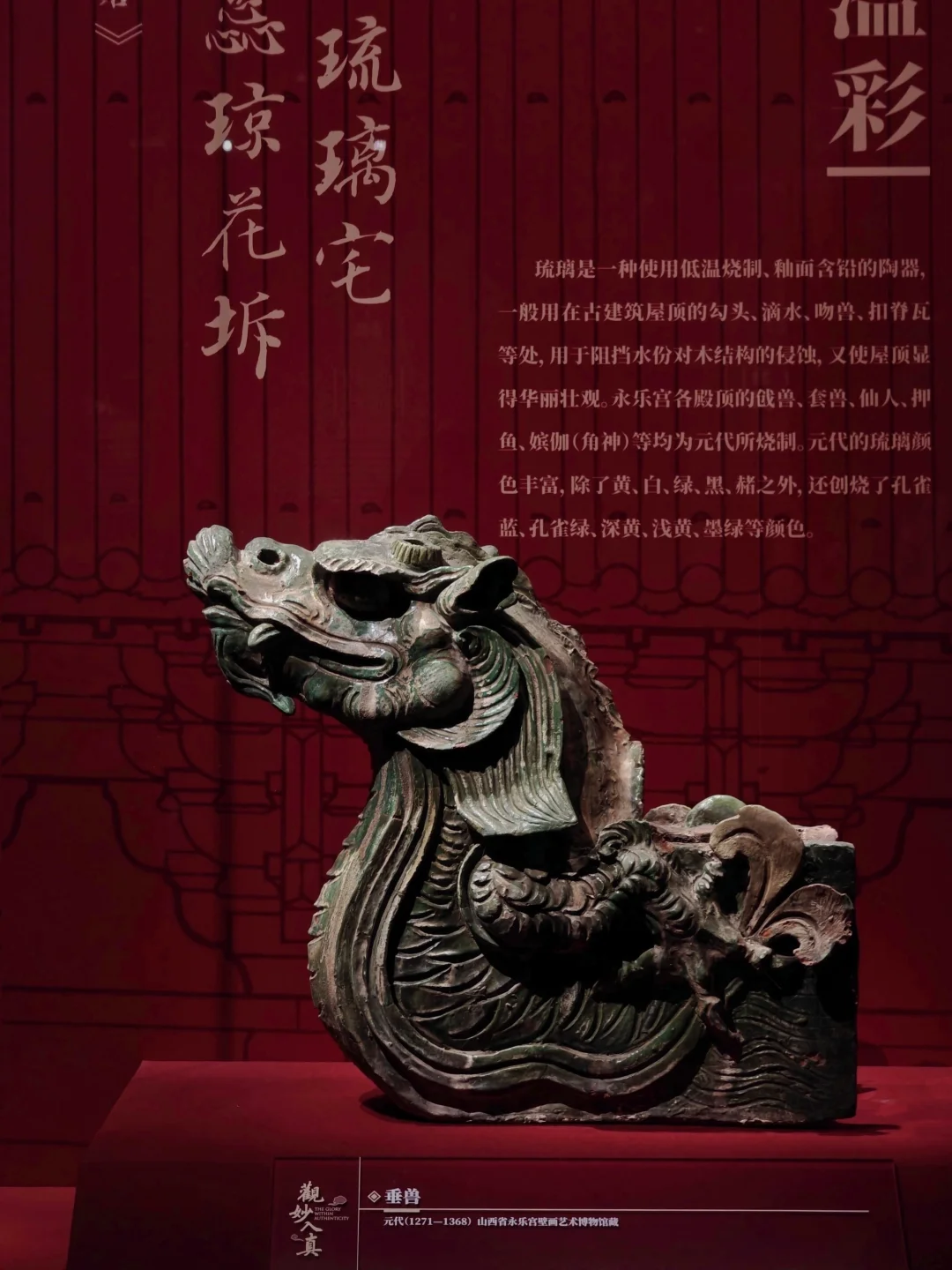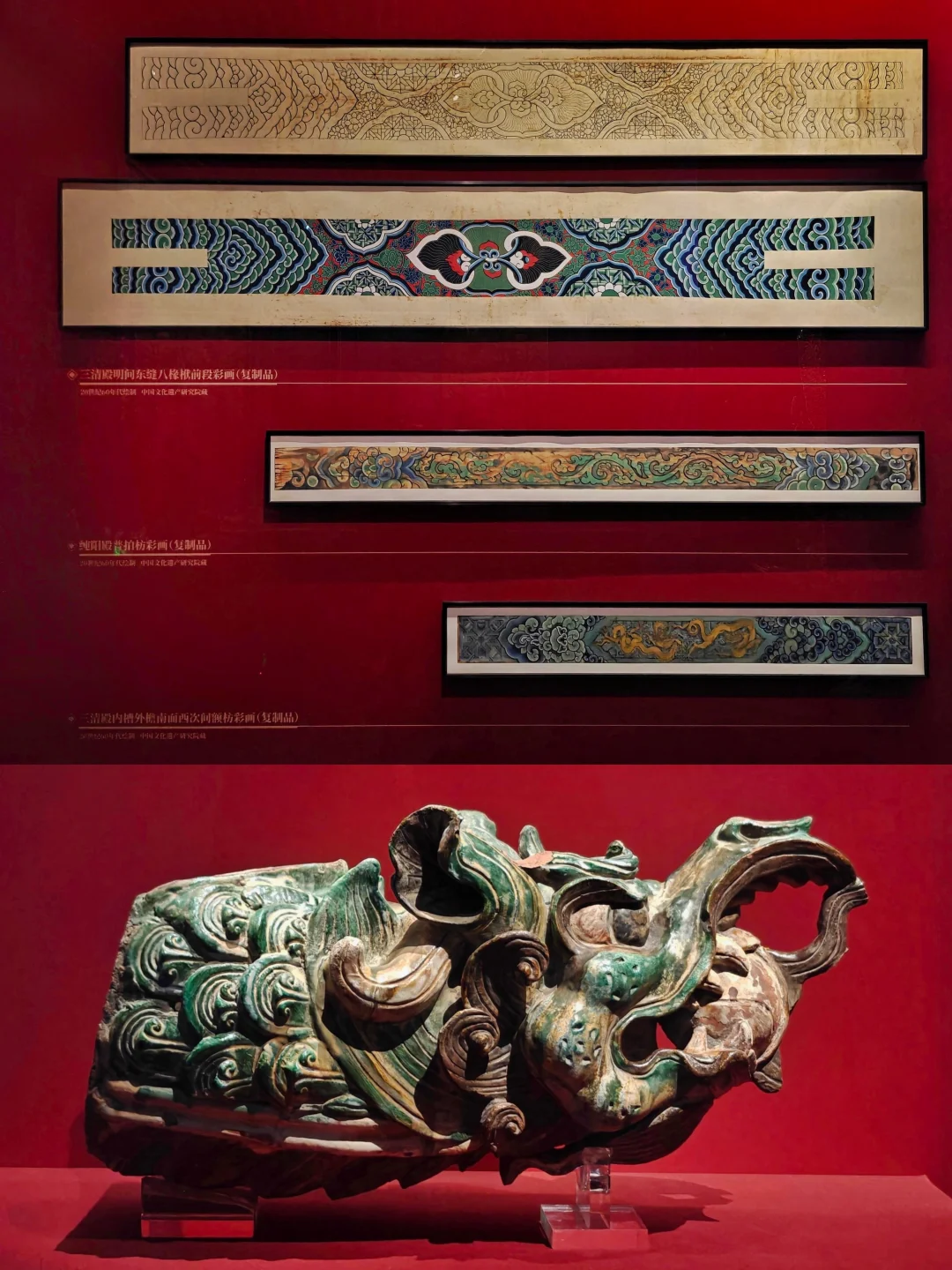 🔸三清殿琉璃鸱吻与正脊堆花脊身(举世罕见。鸱吻巨龙盘曲式,红泥胎孔雀蓝釉,五品合成,与正脊连接处塑有胡人献宝、风伯云纹等)