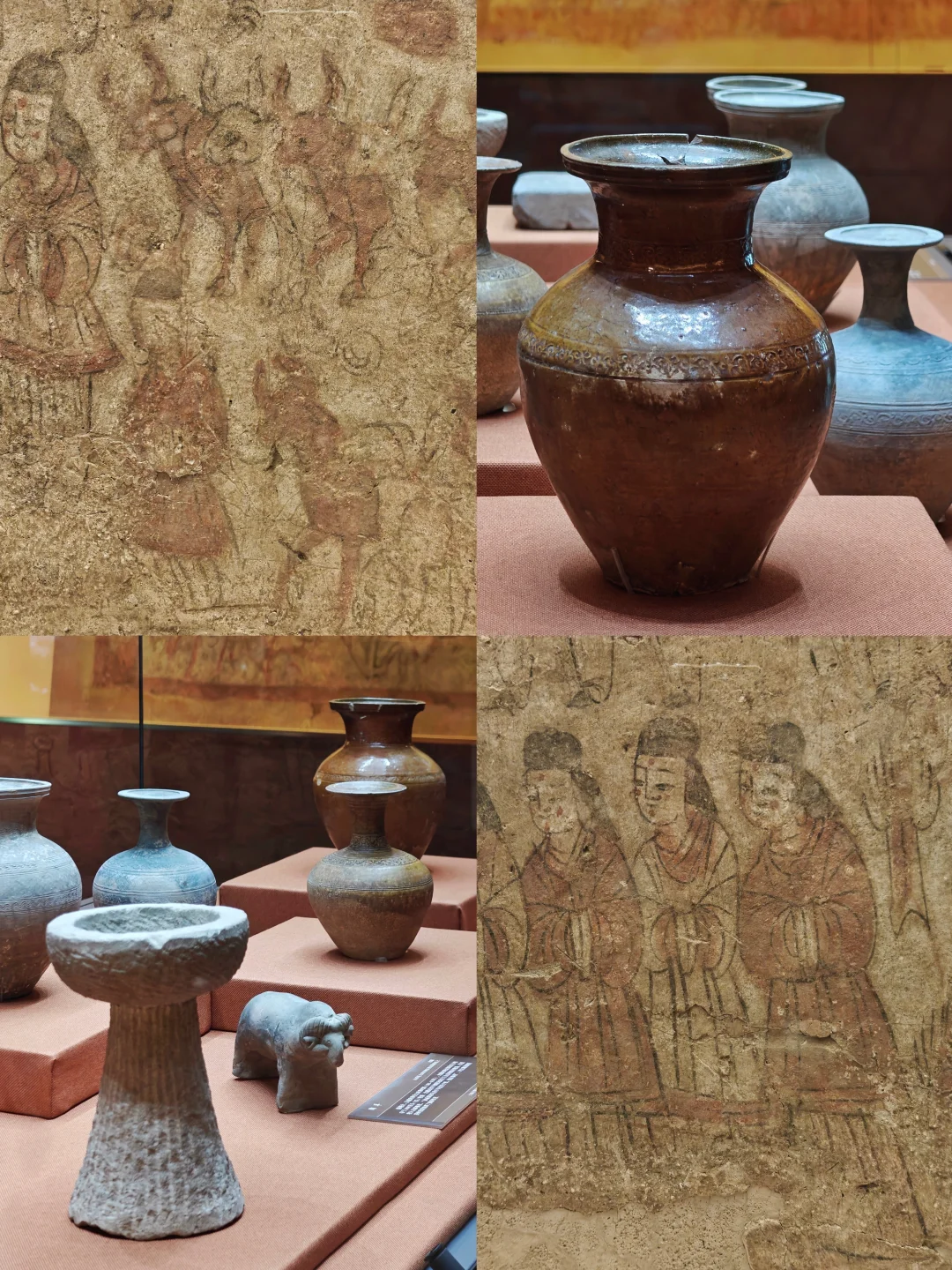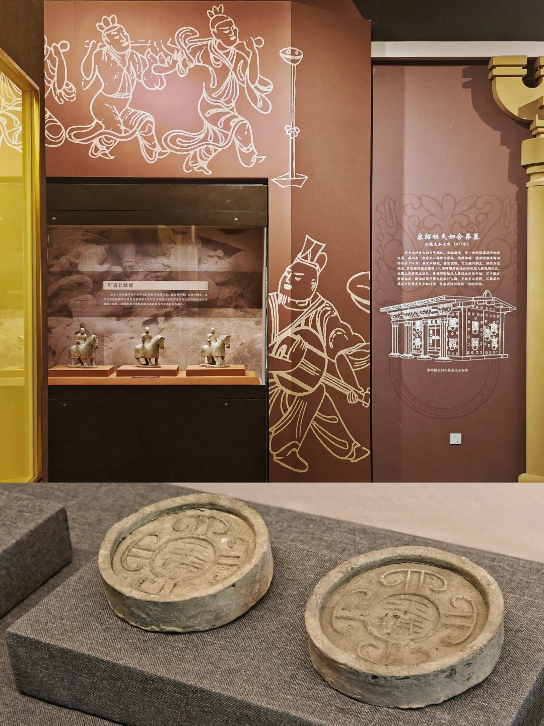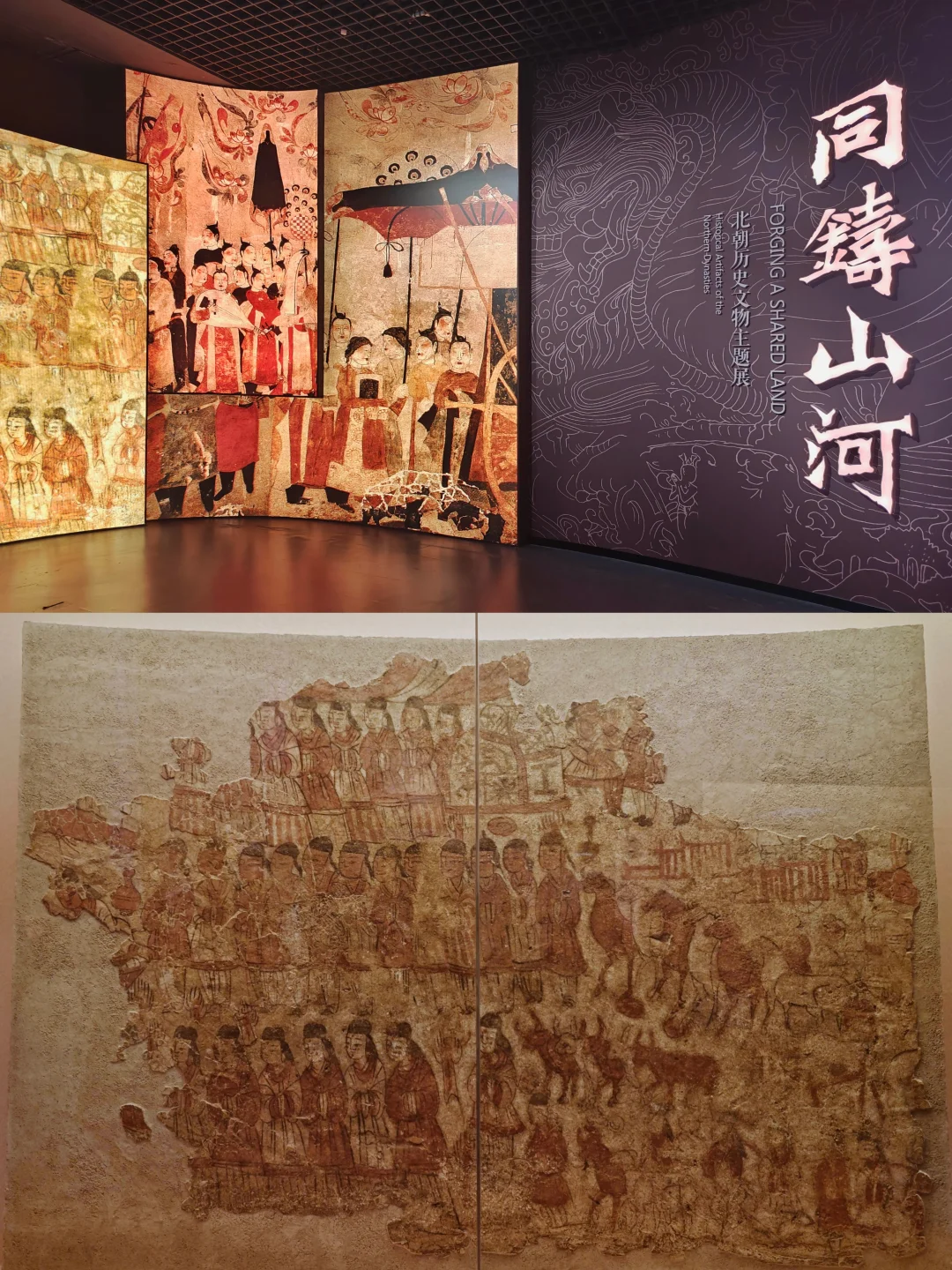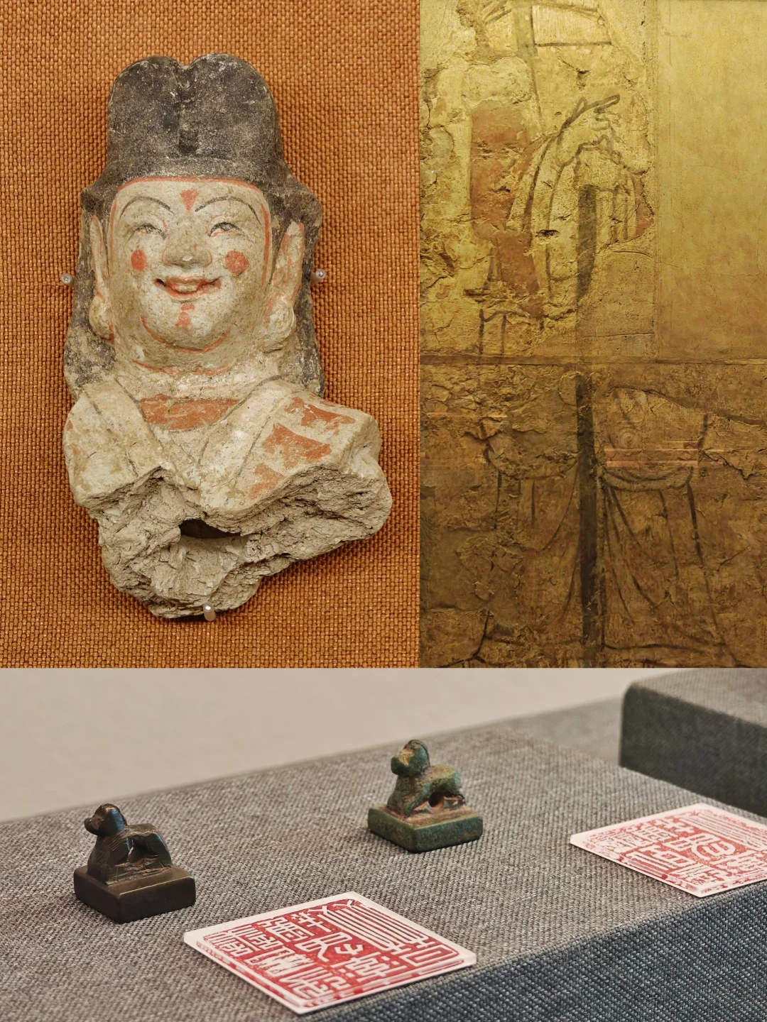 北魏 | 墓葬壁画侍从图、仪卫武士图,玻璃半球形泡饰,彩绘陶饲鸟童俑,彩绘陶女俑头,釉陶风帽仪卫俑,太和五铢,《魏鲁郡太守张府君清颂之碑》(清拓片),彩绘陶骆驼,四面佛龛石造像塔(下两层东魏),北凉“四角羌王”鎏金铜印,青釉莲花碗