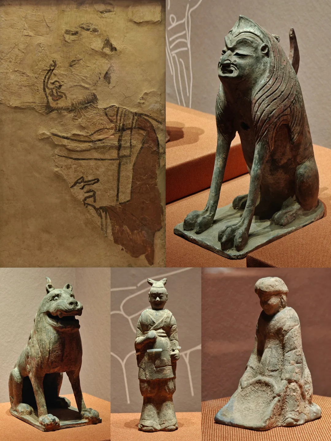 东汉 | 双鹿纹金饰牌,三鹿纹金牌饰(复制品),双马纹铜饰牌,金项饰,漩涡纹金耳饰,四乳四禽纹铜镜(受匈奴影响的毁镜葬实例),双耳圆足青铜鍑,平城瓦当(西汉)