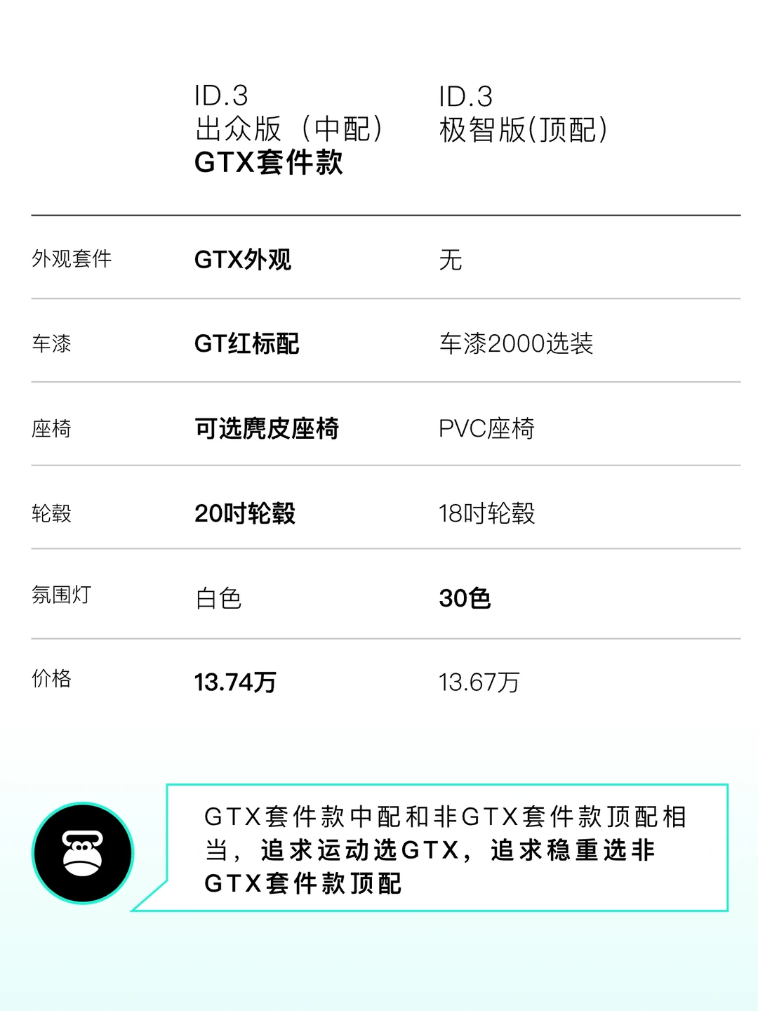 -花小钱装个大的!算下来ID.3 中配 GTX套件款和ID.3 顶配价格差不多,但原厂20寸轮毂搭配Alcantara和运动包围,自己改至少得花2万多,还不一定合规,这波上汽大众真的懂玩家