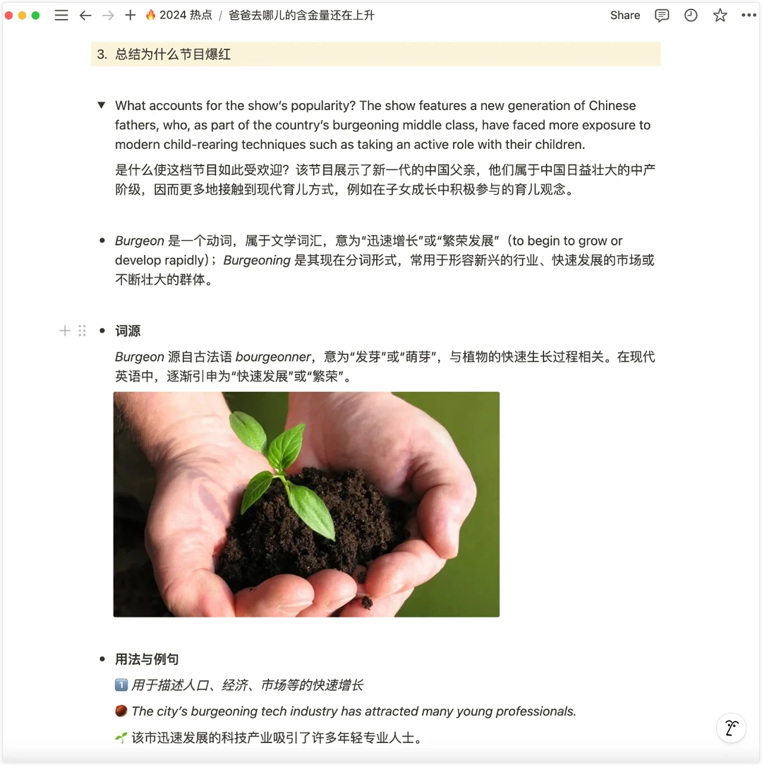Burgeoning 是其现在分词形式,常用于形容新兴的行业、快速发展的市场或不断壮大的群体。