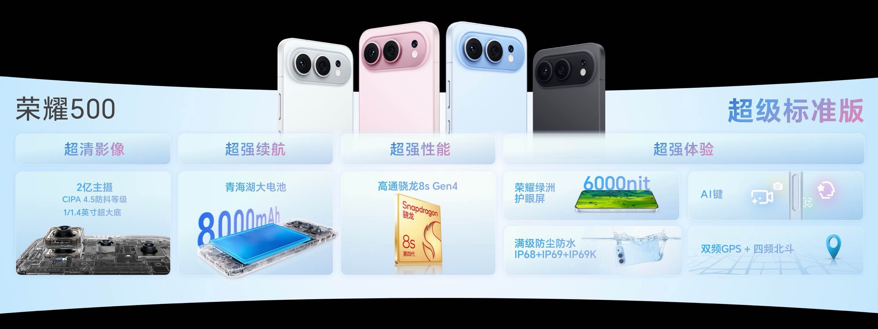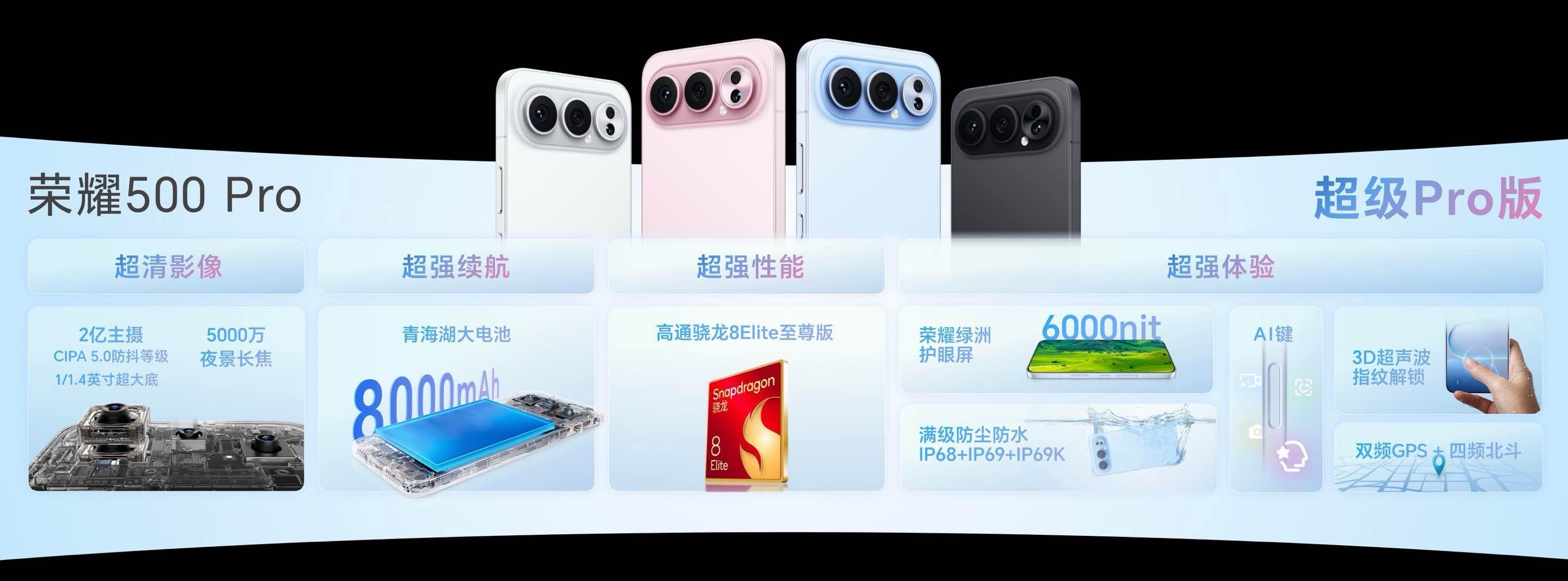 荣耀500系列终于发布了!影像很有看头,全系2亿AI超清人像+1/1.4英寸大底传感器,Pro版新增5000万双防抖长焦(CIPA5.0防抖);前后置Live人像、6种胶片Live效果,支持Live路人消除、4K转Live、AI破框3D特效等。标准版搭骁龙8s Gen4、Pro版搭骁龙8至尊芯片,适配幻影引擎3.0;全系8000mAh青海湖大电池(额定7800mAh),标准版80W有线快充,Pro版加配50W无线快充,支持27W有线反充。全系搭载1.5K绿洲护眼屏,支持120Hz + 3840Hz高频PWM调光,最低可调至1nit亮度, Pro版有超声波指纹,全系IP68&IP69&IP69K防水,7.75mm轻薄机身+1.05mm行业最窄黑边,曜石黑、月光银、星光粉、海蓝宝4款水晶配色,搭载MagicOS 10系统。你们觉得如何呢?