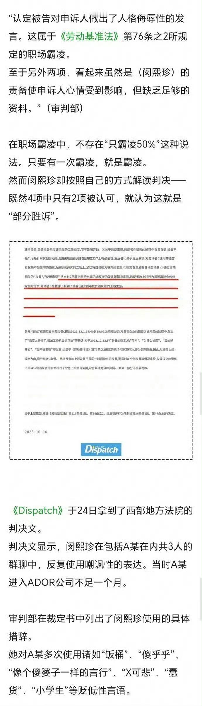 D社曝光了闵熙珍职场80的判决书闵熙珍在3人小群聊里疯狂输出“饭桶”“蠢货”“X可悲”等侮辱词汇,闵熙珍辩称这是“亲切指导”。这算哪门子亲切?建议查查词典。。法院明确认定这不属亲切用语,洗白失败,堪称职场PUA大型翻车现场,不是说爱女吗到底爱在哪里了…
