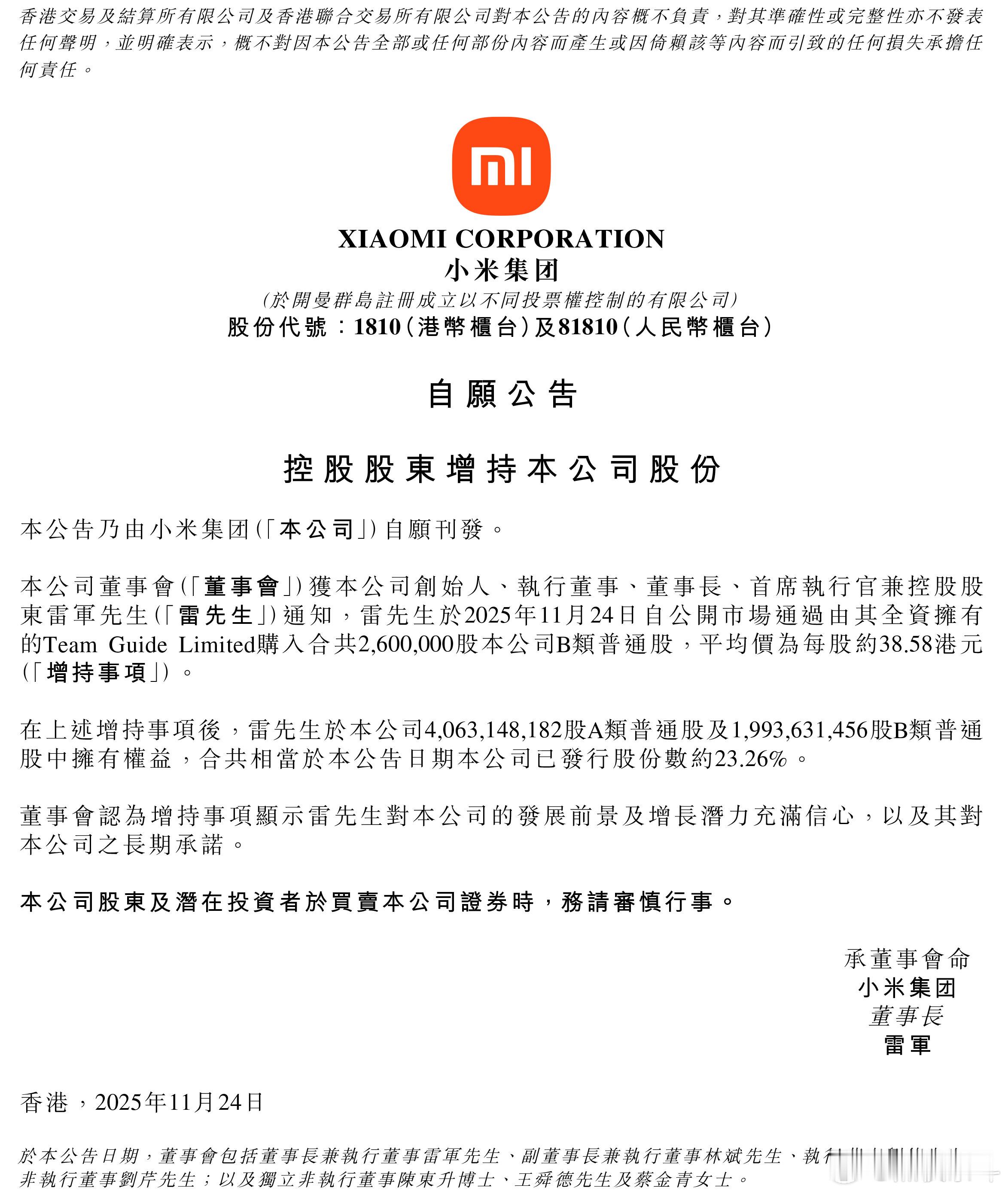 雷军于2025年11月24日自公开市场通过由其全资拥有的Team Guide Limited购入合共2,600,000股本公司B类普通股,平均价为每股约38.58港元,总价约100,308,000港币。