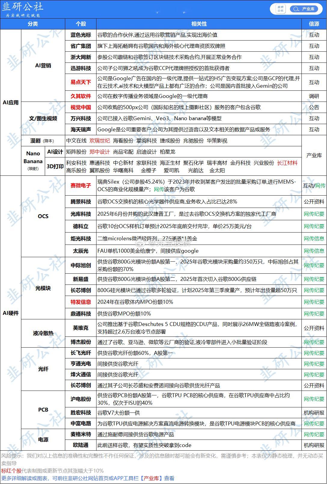谷歌链标的及OCS光交换机器件主要建议关注以下:中际旭创:谷歌光模块主供应商;光