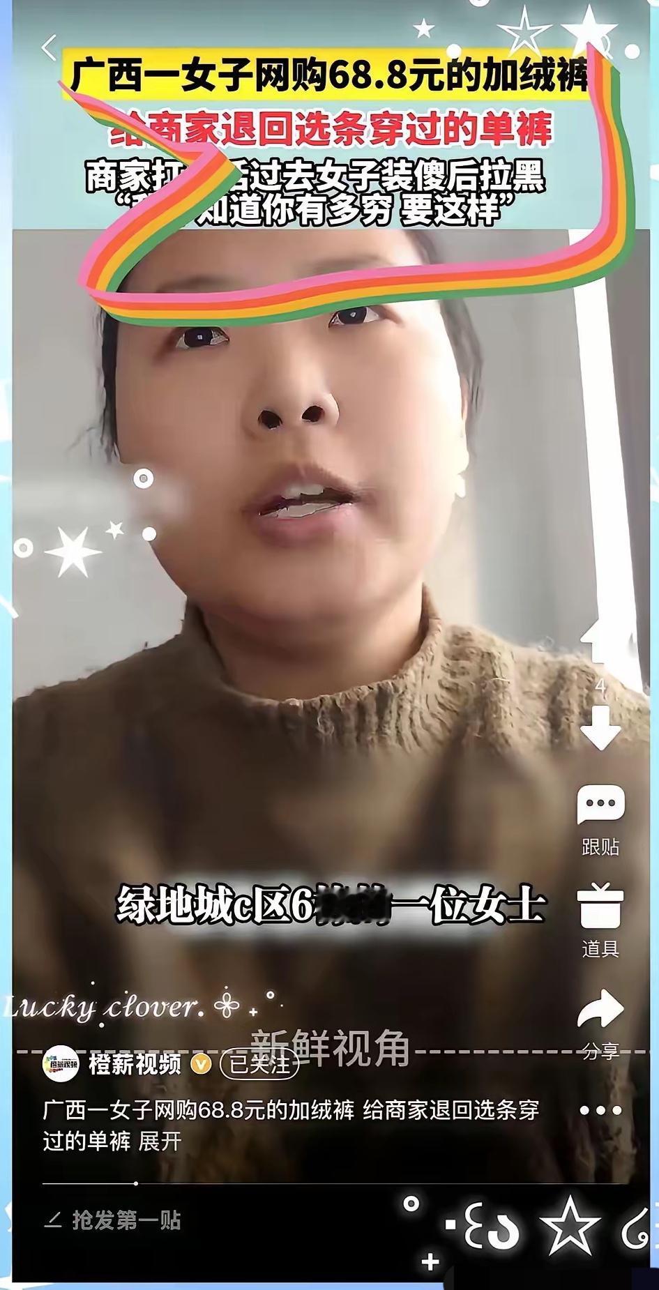 这得穷成了啥样啊? 60块钱就能卖掉的自尊,到底值不值?广西这位大姐是真敢操作啊!网购加绒裤留下,退回去条旧单裤,商家沟通还直接拉黑,算盘打得全网都听见了。 可她忘了,互联网哪有不透风的墙?商家直播曝光小区楼栋,亲戚邻居全知道,这下脸是彻底丢干净了。 其实穷从来不可怕,可怕的是为了点小钱就丢了做人的底线。60块买不来体面,却能毁了口碑,这笔账怎么算都亏。 你们觉得商家曝光楼栋号过分吗?换成你遇到这种事会怎么处理?