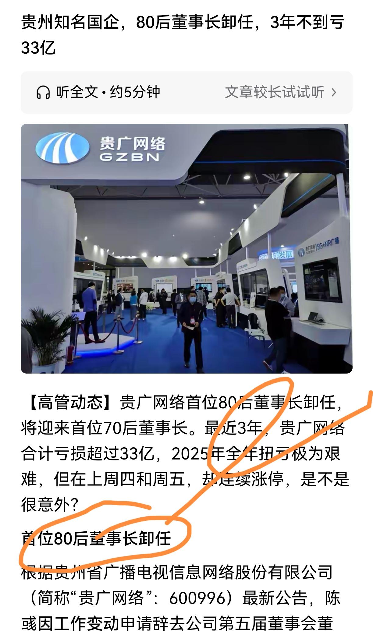 巨亏33亿,突然连续涨停!80后董事长走后,贵州这家国企的内幕很深。 就在上周,贵州发生一件魔幻大事!一家堂堂省属国企,贵广网络,三年狂亏33亿,算下来每天一开门三百万就没了。 可偏偏,它竟在上周四、五(11月20、21日)连续涨停,惊掉所有人下巴!为啥?因为它刚刚换帅:走的是一位80后政界精英,迎来的,竟是一位干了半辈子炸药的“爆破专家”!股民们瞬间炸锅:这是要来“爆破”重组,还是要“炸掉”亏损?好戏,开场了! 这事说起来挺魔幻的。一家国企,三年时间亏了整整33个亿,平均每天一睁眼就要亏掉300万。这业绩,搁哪个公司都得愁云惨淡吧? 可你猜怎么着?就在上周四、周五,这家公司的股票,居然连续两天涨停!这就好比一个病入膏肓的人,突然在百米赛跑中拿了个第一,把所有人都看傻了。 这家公司就是贵州的贵广网络〖贵州省广播电视信息网络股份有限公司(简称“贵广网络”:600996)〗。而这一切的魔幻,都跟两个人的交接班有关。 走的是个“80后”的官场精英,来个的是个“70后”的爆破专家。 ①先说说走的这位。 董事长陈彧,81年生的,标准的80后。他的履历那叫一个漂亮,从人民银行到省政府办公厅,再到县委、省委宣传部,是位正儿八经的正处级干部。可以说,他是个深谙体制内规则的“文化人”。 他在公司当了大约两年半的家,结果呢?公司亏钱的步伐一点没停。现在,他拍拍屁股走了,留下一个巨亏的烂摊子。说句公道话,这也不能全怪他,有线电视这行业,现在谁家还看电视啊?都被手机和网络冲垮了。 ②再来说说新来的这位。 接班的代青松,70后,他的履历就更有意思了。之前几十年,都在跟炸药、爆破打交道!从化工厂技术员,一路干到各大爆破公司的一把手。这是个专门搞“破坏”的硬核专家。 让一个玩炸药的人,来管一个搞电视网络的,这个操作是不是很骚?也难怪股民们会脑洞大开:这是嫌公司亏得不够快,派他来直接把公司“炸掉”吗? 当然,这只是玩笑。 股民们真正的期待是,这位“爆破手”不是来炸楼的,而是来“炸掉”那些僵化的体制、落后的模式和沉重的包袱的!他们期待一场轰轰烈烈的“资产重组”,来一场大手术,让公司脱胎换骨。 ③所以,故事的核心就这么简单: 一个亏到妈都不认识的公司,换了一个背景极其硬核的新老板,让广大股民们瞬间看到了“破而后立” 的希望。于是,大家用钱投票,直接把股票买涨停了。 或许有人会疑问:这位新来的“拆弹专家”,手里拿着的,到底是能救公司于水火的“金剪刀”,还是一根点燃导火索的火柴? 这出“亏损国企大换血”的连续剧,第一集就如此高潮迭起,后面的剧情,我们只能拭目以待。 但有一点是肯定的:在咱们大A股,故事,永远比业绩更精彩。