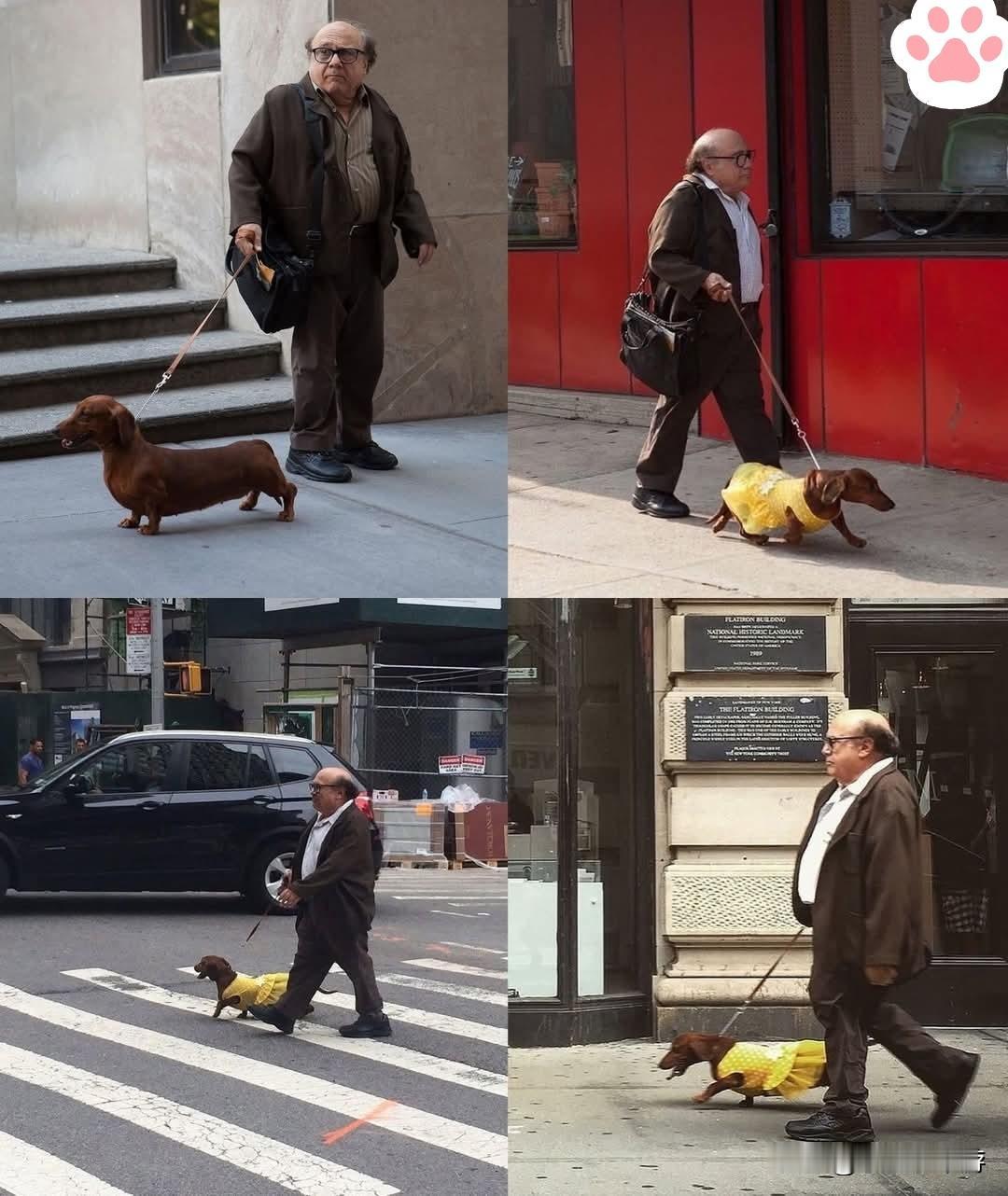 好莱坞演员丹尼·德维托在纽约遛一条腊肠犬。