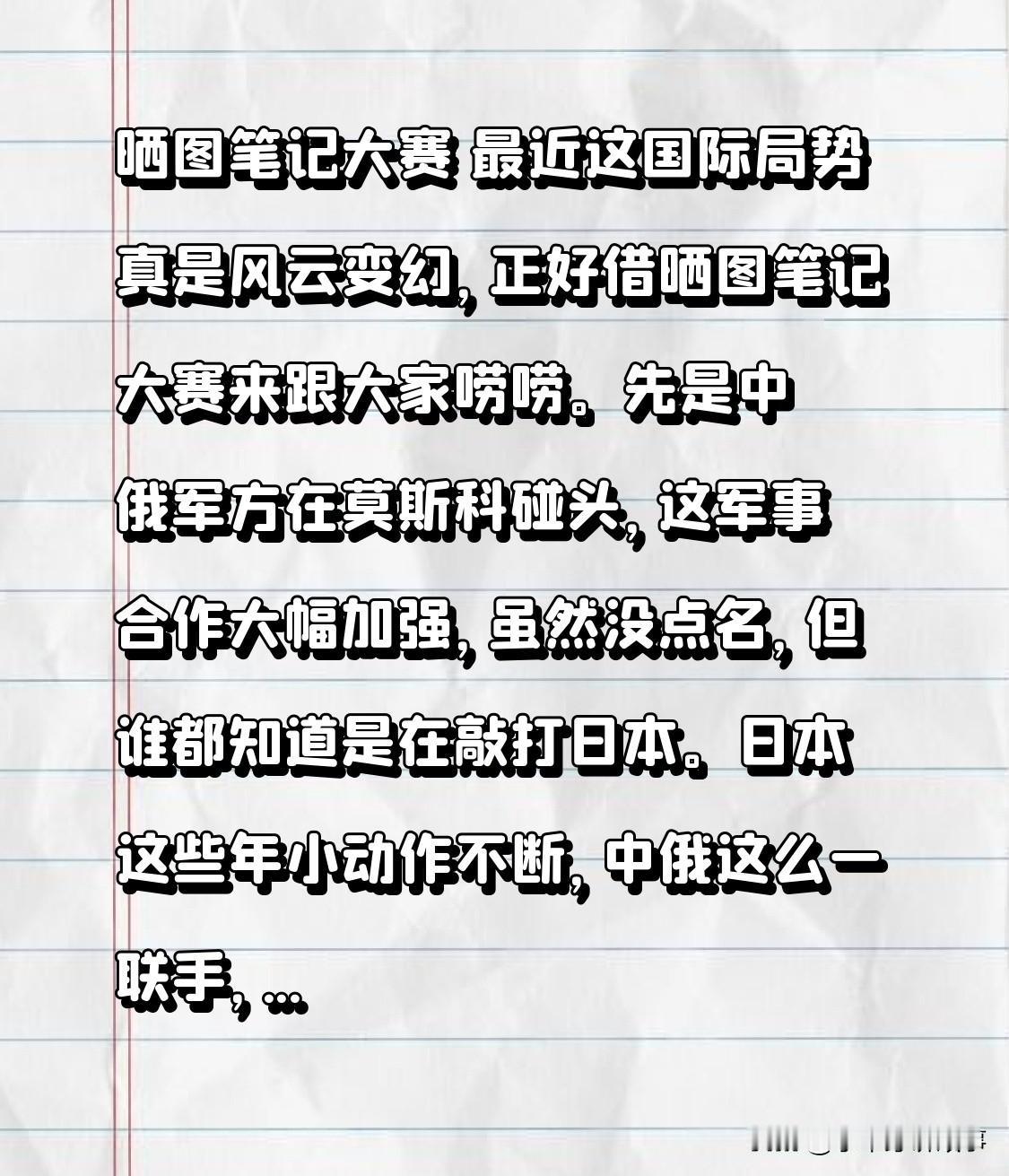 晒图笔记大赛 最近这国际局势真是风云变幻,正好借晒图笔记大赛来跟大家唠唠。 先是中俄军方在莫斯科碰头,这军事合作大幅加强,虽然没点名,但谁都知道是在敲打日本。日本这些年小动作不断,中俄这么一联手,日本可得好好掂量掂量自己了。 还有咱福建舰,入列后首次出海,歼 35 弹射起飞,这画面简直太震撼了。这也是用实际行动给高市早苗之流一个警告。咱国家的海军实力越来越强,在国际舞台上更有话语权了。真希望能多看到这样振奋人心的画面,也期待能在大赛里看到更多相关的精彩图片分享!