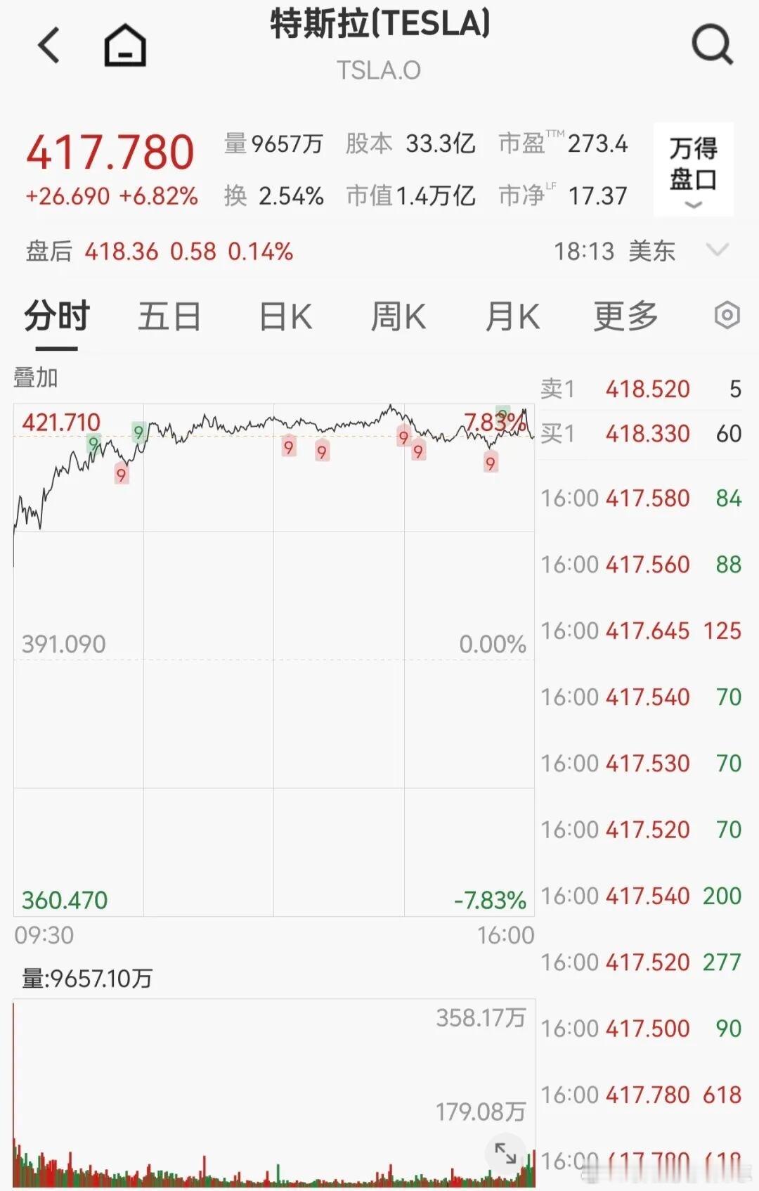 特斯拉狂飙超6300亿元特斯拉高开高走,一度大涨7.83%,全天收于417.78美元,涨6.82%,市值一夜之间飙升888.78亿美元,约合人民币超6312亿元。