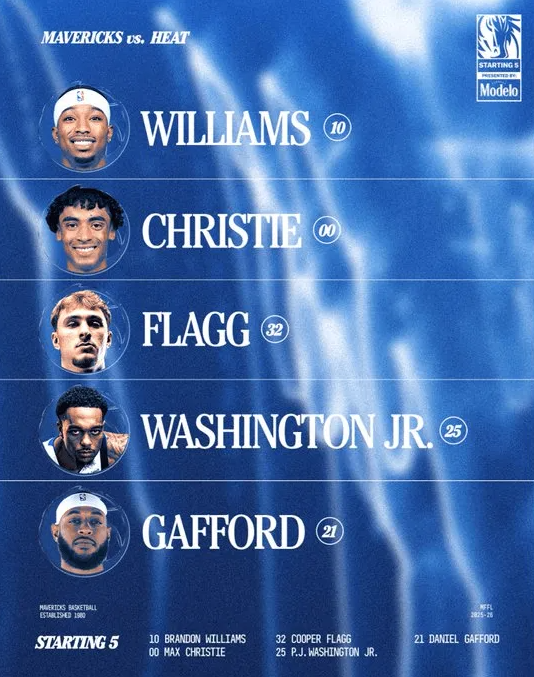 NBA常规赛,独行侠将对阵热火。 独行侠首发:布兰登、克里斯蒂、弗拉格、华盛顿、加福德。 本场比赛将于8:30开始。