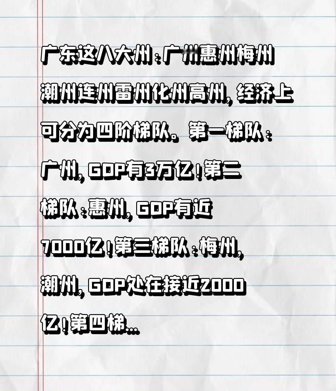 广东这八大州: 广州惠州梅州潮州连州雷州化州高州,经济上可分为四阶梯队。 第一梯队:广州,GDP有3万亿! 第二梯队:惠州,GDP有近7000亿! 第三梯队:梅州,潮州,GDP处在接近2000亿! 第四梯队:雷州,连州,化州,高州,GDP处在200亿至900亿之间! 而这八大州,除了化州之外,其它七大州都是有着悠久历史的州府! 还有三府不在榜上,分别是,端州府,罗定州,南雄府!