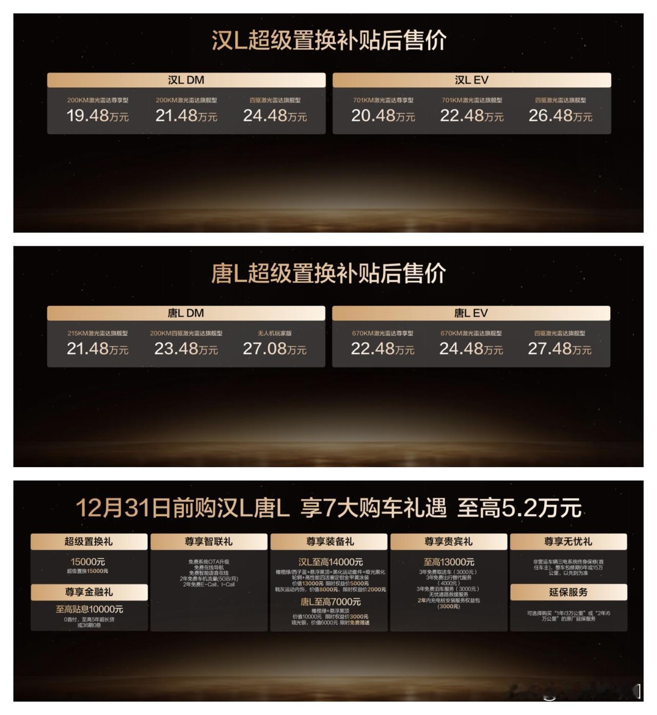 这几天在广州车展的朋友得先去逛逛50万级的车型,然后再来逛逛比亚迪展台呀,因为汉L唐L携新车色及OTA正式发布了,对比对比会更有感触。 一是新车色也是玩出高级感,汉L的橄榄绿在阳光下泛金光,暗光下变墨绿;西子蓝强光下呈现珠光金属白,弱光时转为清澈碧蓝。选装黑化运动套件后,整车战斗气息直接拉满。 二是得看看满配的车型是怎样的!汉L EV、唐L EV搭载超级e平台全域千伏架构,5分钟充电400公里,喝个咖啡功夫,足够开1星期了。 再就是汉L EV版零百加速2.7秒,极速305km/h,媲美百万超跑。混动版更是精打细算,汉L DM亏电油耗最低仅3.9L/100km,综合续航达1400km,谁说性能和节能不能兼得的? 三是智能进化来到“全程免接管”阶段:DiPilot 300系统也是解锁了“车位到车位”领航辅助。设置导航后,车辆自动驶出车位、识别闸机、跨楼层巡航泊入车位,全程无需人工干预。 我是建议到了广州车展,完全可以把各个车型比较一下,多去看看50万级别的车型,再来看看比亚迪的汉唐L,应该会更认同“汉L和唐L科技满配颜值翻倍”这句话了。