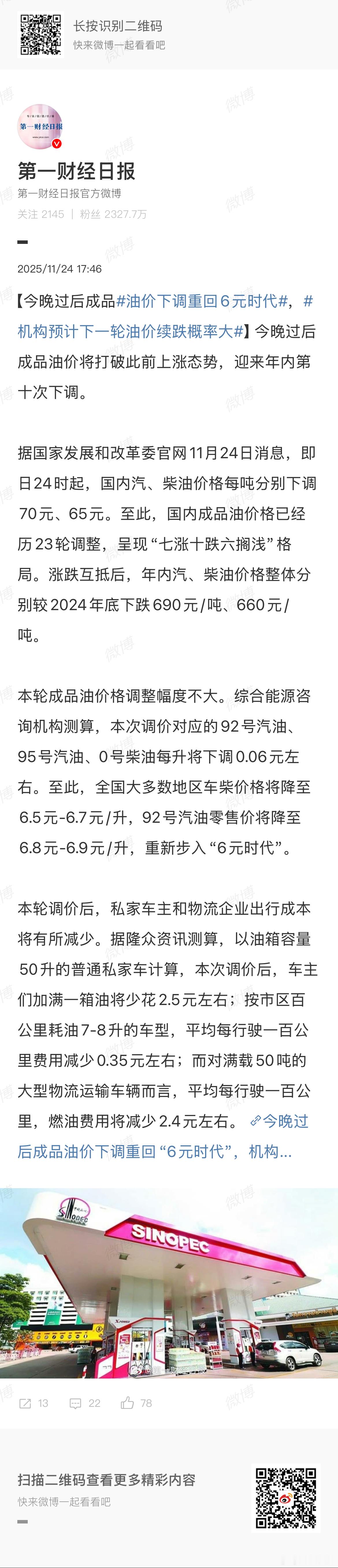 记得上次调整时就使劲宣传“重回6元”,是6.9多。这次降了6分钱,6.8-6.9,谁说6.9不是6呢对吧……一般是贵15-20%左右,所以去看了下gasbuddy,那边平均价格是5.71元/升,符合这个日常差距……