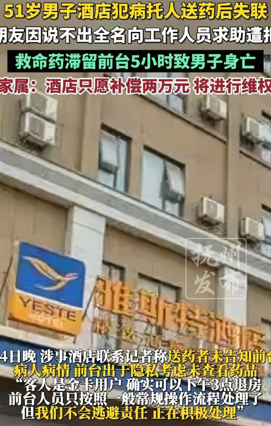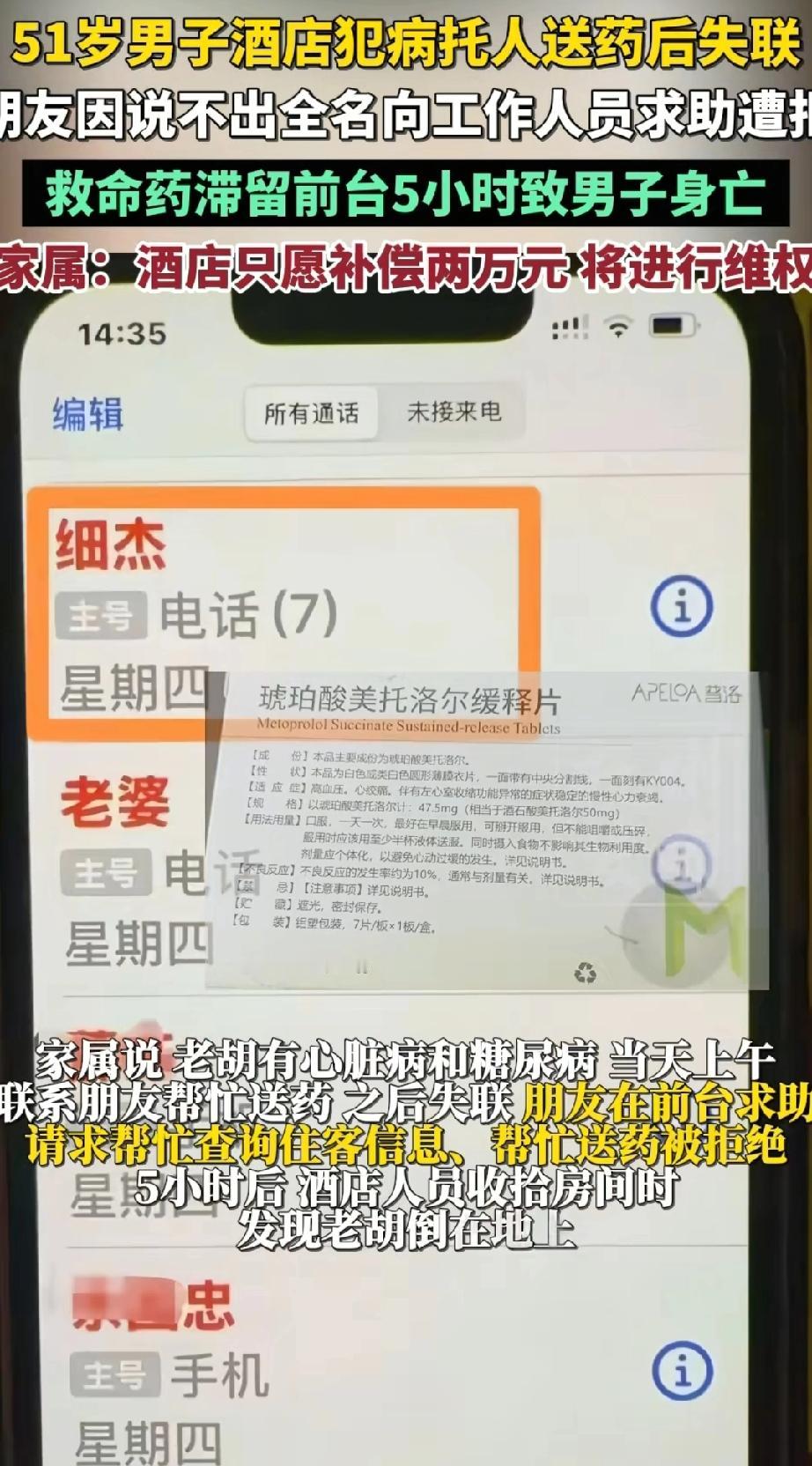 湖北武汉,一名51岁患有心脏病和糖尿病的男子,在酒店发病时向朋友求助送药。朋友拿着药赶到酒店前台,请求前台协助查询男子的住宿信息,却被酒店前台拒绝。 无奈之下,朋友只好把药交给前台,未告知男子病情便离开了。 酒店前台也未查看这是治疗何种疾病的药物。五个小时后,酒店工作人员收拾房间时,发现男子倒在地上,已没了生命迹象。 不清楚男子当时是心脏病发作,还是糖尿病酮症酸中毒发作,这两种情况都十分危险。 如果药物能及时送到房间,也许能救男子一命。 酒店承认工作人员存在失误,仅愿给予家属2万元人道主义赔偿。 家属对这一赔偿金额并不认同,决定通过司法解剖来鉴定酒店应承担的责任大小。 通常酒店退房时间为中午12点,因该男子是酒店金牌客户,有权将居住时间延至下午3点。 也正因如此,酒店工作人员未能及时发现男子的病情。 在这件事上,酒店负有责任,未能及时查询住客信息并送药至客房。 朋友帮男子买了药,应该清楚是治疗什么病的,还手持手机与酒店前台交流,酒店前台拒绝查询男子信息时,他本可联系朋友,朋友一直未回应,他理应主观判定朋友病危,及时报警,请警察帮助查询男子的房间号。 朋友如果多一个举动,也许男子就不会死亡。可是一般人都不会想的那么周到。 然而,男子自身责任更大,明知自己患有心脏病和糖尿病,发病时为何不直接去医院治疗,反而想自服药物解决,这是不妥之举,是对自己的不负责任,应该承担最大的责任。 来源:封面新闻 抚州发布