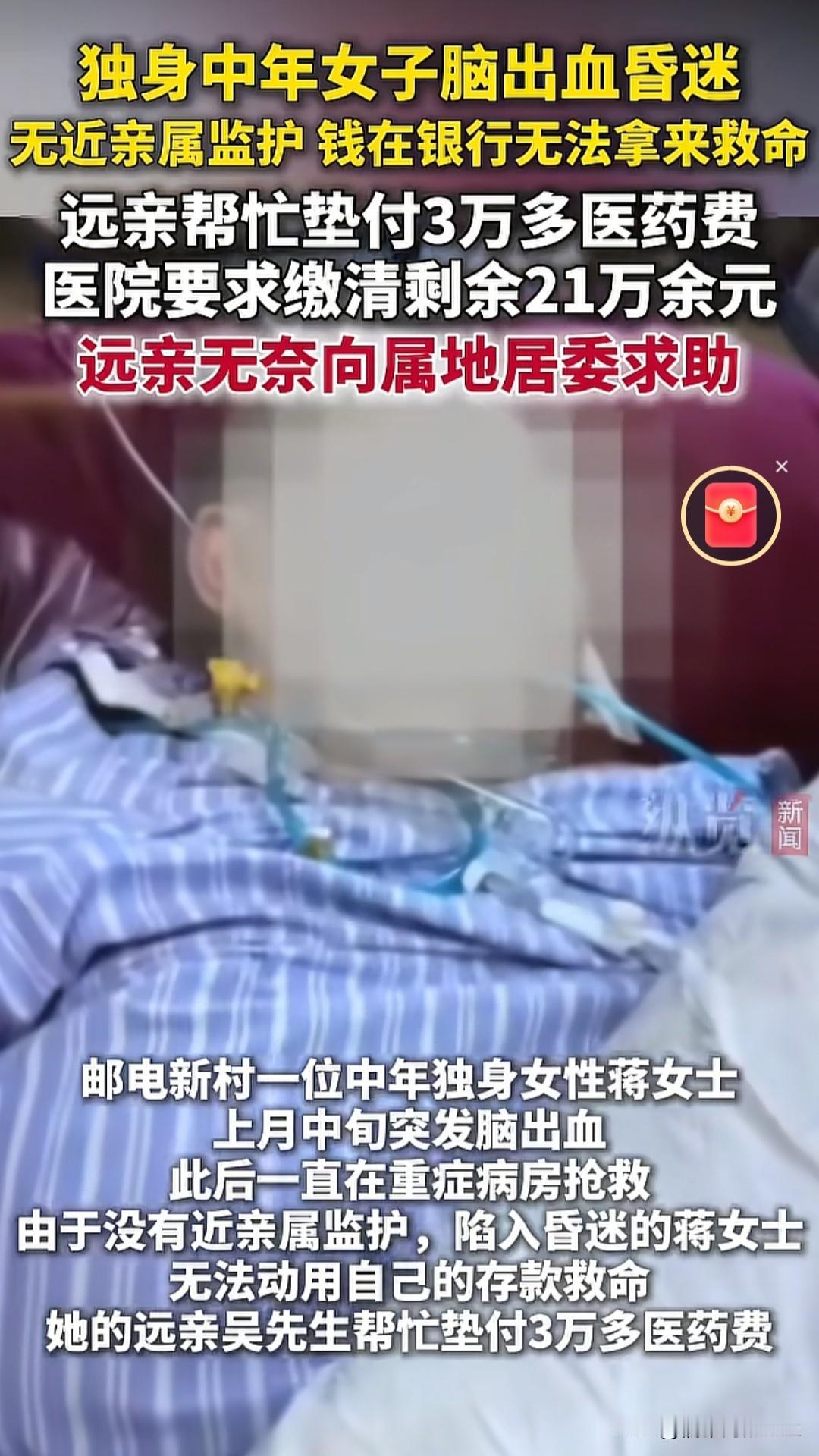 独身的人最怕的莫过如此。46岁女子突发疾病,有钱有重疾险却无监护人办理,21万元的医疗缺口无法到位,愁坏了远房亲戚。 今年10月,上海46岁独身蒋女士突发脑出血被同事送进了医院,因手术需家属签字,但蒋女士无配偶,无子女,无父母,就连姑姑和舅舅也都不在了,幸亏她入院时还有点清醒,拔拉了一圈,最后打电话一个一年只见一次面,同在上海的远房亲戚吴先生。 吴先生接到电话马上赶了过来,并支付了3万元住院费。 此后蒋女士病情恶化陷入昏迷,一直在重症病房抢救。因蒋女士昏迷,虽然她有存款和买了重疾保险,但没有近亲属作为监护人办手续,每天五千,一万的费用,医院费用已高达21万元,吴先生也无能为力。 经全力治疗,蒋女士已脱离了生命危险,但能否恢复到能自行签字的水平也不得而知,也没有其他远亲愿意出面,医院要求吴先生缴清余下的21万元。 吴先生称,蒋女士是他爷爷的姐姐的孙女,也是远亲,每年就是过年聚餐才见上一面。 吴先生咨询了律师,由于他和蒋女士是远亲,没有法定继𠄘关系,一旦蒋女士病情恶化,无法主张通过蒋女士财产还款。让他去找属地居委会为其监护人。 居委会得到求助马上开始行动,为了解决医药费的燃眉之急,他们分别找蒋女士工资存放的银行及购买重大疾险的保险公司联系,试图找出临时方案。 但在几方碰壁之后,此事又交到了法院,须先申请宣告蒋女士成为无民事行为或限制民事行为能力之人后,再通过法院梳理成为监护人的相关流程,再指定蒋女士的监护权,关键是指定谁更可靠,最亲一点的姑姑的孩子远在兰州,估计也不亲。 蒋女士作好了养老的经济和医疗准备,却怎么也没算到46岁还没老的年纪,却先倒下了,钱和人彻底分离,一时却又无法找到合适的人来衔接,幸亏她的远亲吴先生够意思,才得到了及时的治疗。 现在独身的人更多,有的连远亲都没几个,甚至互相之间都没来往,不认识。真有事,都找不到人帮忙。监护人指定早也坏事,指定晚了怕有事。 以后,会有更完善的程序和制度,更人性化的政策来解决这个问题。 但我觉得血脉亲情还是更优越。人算不如天算,光有钱也没用,独身的人注定有孤独带来的忧伤。还是要结婚生孩子好,早年有父母,中年有夫妻,晚年有子女,一生有亲情相随,来时有人接,走时有人送,心有归宿,情有出处,也不枉此生!