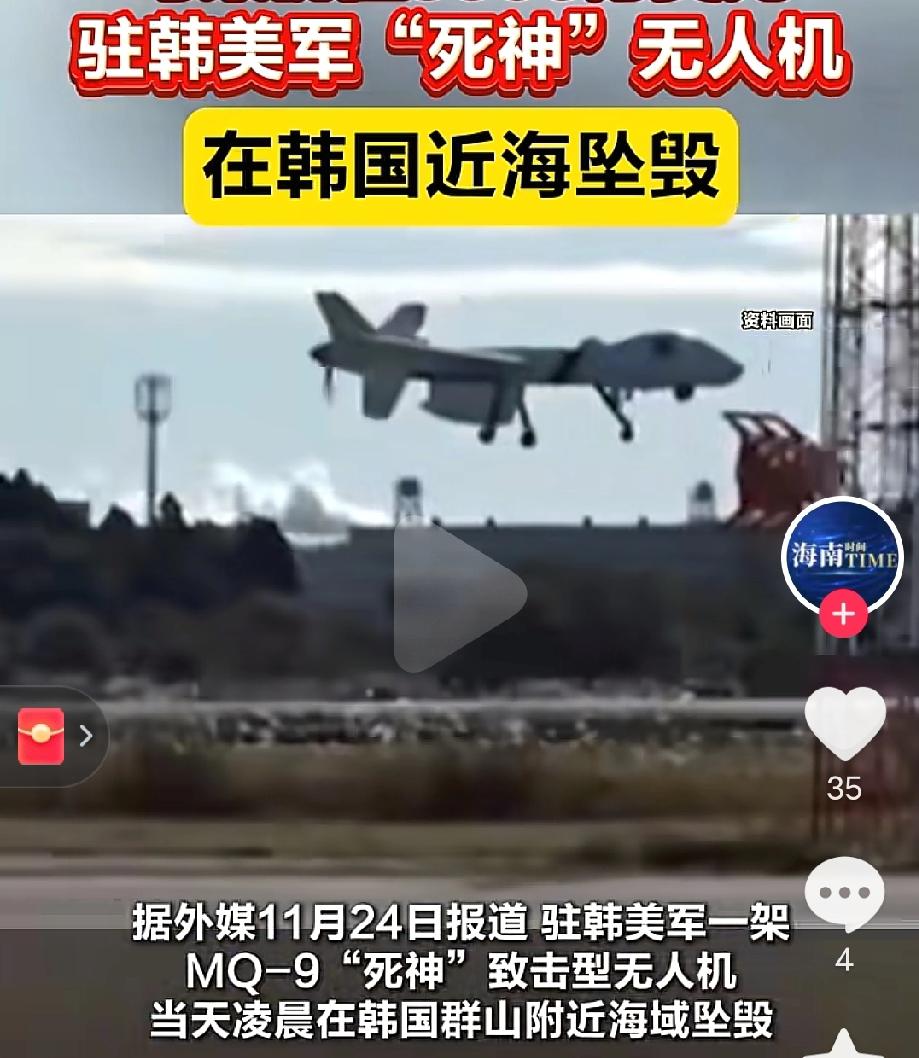 美军无人机又出事了! 凌晨4点多钟,韩国群山基地附近海域突然响起一声巨大的爆炸声,那架价值3500万美元的MQ-9"死神"无人机,就这么没了。今年这已经是第三架了,南海那两架估计大家还记得。 被叫做"死神"的这架无人机,上个月9号才刚刚运到基地部署好,结果连三个月都没到就出事了。美军对外宣称是"不明原因导致的失控坠毁",但这说法谁会信呢?依我看,这名字起得真不吉利,"死神"最后倒好,反倒把自己给"咒"没了。 说起来这钱花得可真不值,3500万美元啊,能建多少所学校?又够多少困难家庭好好吃几顿饱饭?美军在全世界到处搞事情,这下倒好,连飞机都开始用坠毁来"抗议"了。 现在问题就来了:到底是技术出了问题,还是被人动了手脚呢?美军接二连三出这种事,该不会是在故意掩盖什么见不得光的秘密吧?这背后到底藏着什么?咱们接着往下看。