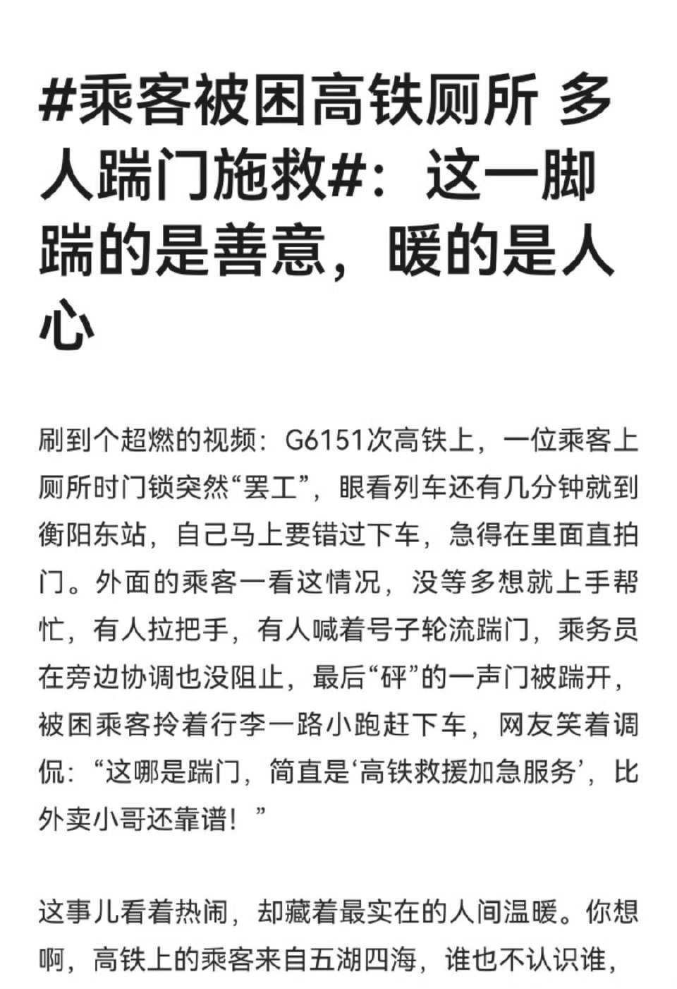 这一热搜既见人间暖意,也显服务短板。乘客被困时众人合力施救,彰显了陌生人之间的互助善意;广州铁路的及时通报、致歉与返程安排,体现了事后补救的诚意。但门锁故障暴露设备巡检漏洞,乘务员提议踹门也反映应急处置的专业性不足。希望铁路部门落实设施维保承诺,优化应急流程,让出行安全更有保障。
