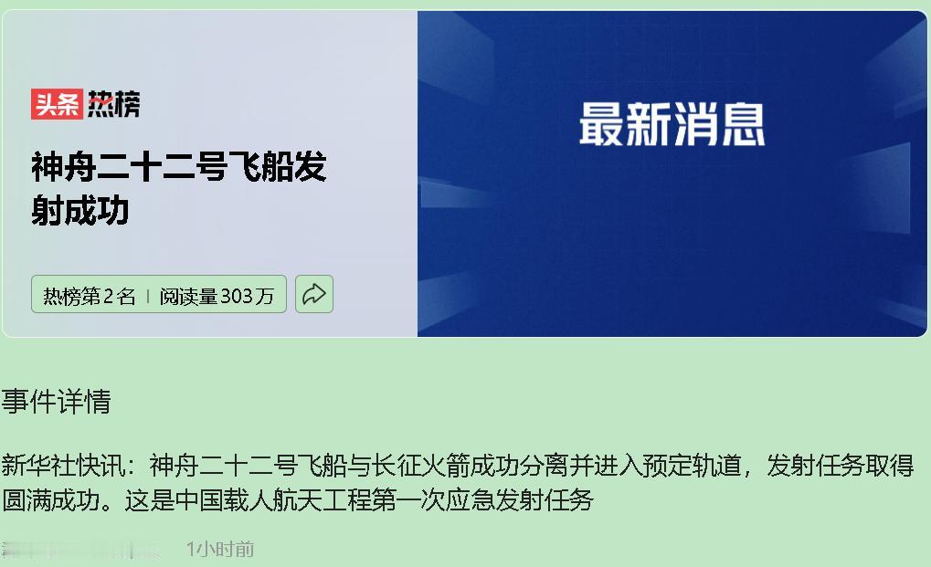 你有没有想过,天上的人想回家,路突然断了怎么办? 11月5号,神舟二十号飞船的窗户被太空垃圾撞裂了。米粒大的碎片,速度比子弹还快。玻璃一裂,返程票当场作废——穿过大气层时,高温能穿透这道缝,人命关天。 地上的人没慌。16天后,神舟二十二号空车出发,不载人,只送货:吃的、药品、新鲜蔬菜,还有修窗户的专用工具。 这事硬核在哪儿?咱们每次发射都有一架备用火箭躺着待命。不是模型,是真家伙,最快8天半就能点火。这次一共用了16天,全流程走了一遍。国际空间站遇到这事得等30天,咱们这速度,算是降维打击了。 说真的,我破防了。这不是技术炫耀,是给航天员的一个承诺:你只管往前冲,后面永远有退路。 生活里也一样。真正的安全感不是"没事的",而是"有事也不怕"。Plan B不是怂,是底线。 最浪漫的中国式浪漫,就是有人告诉你:放心飞,我能带你回家。